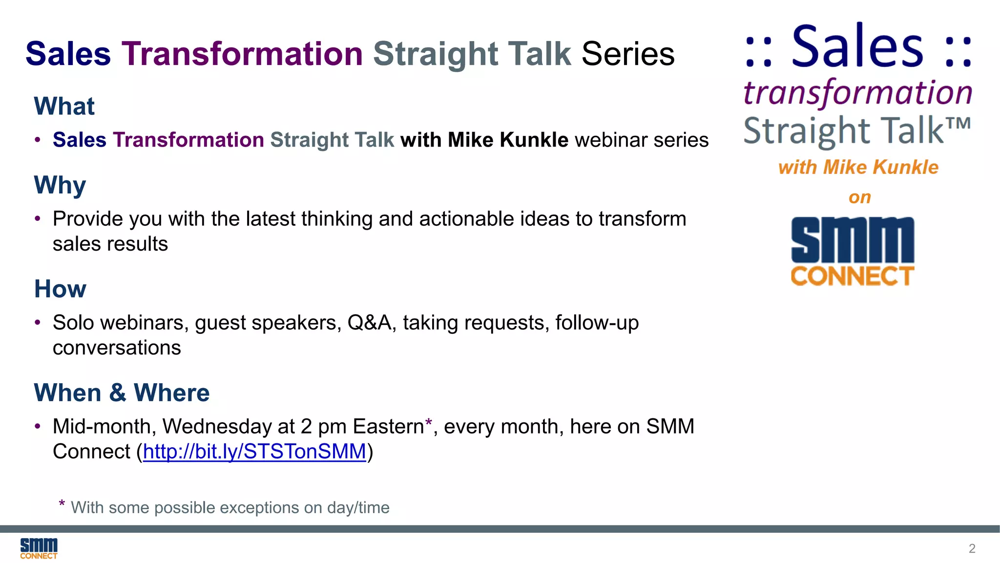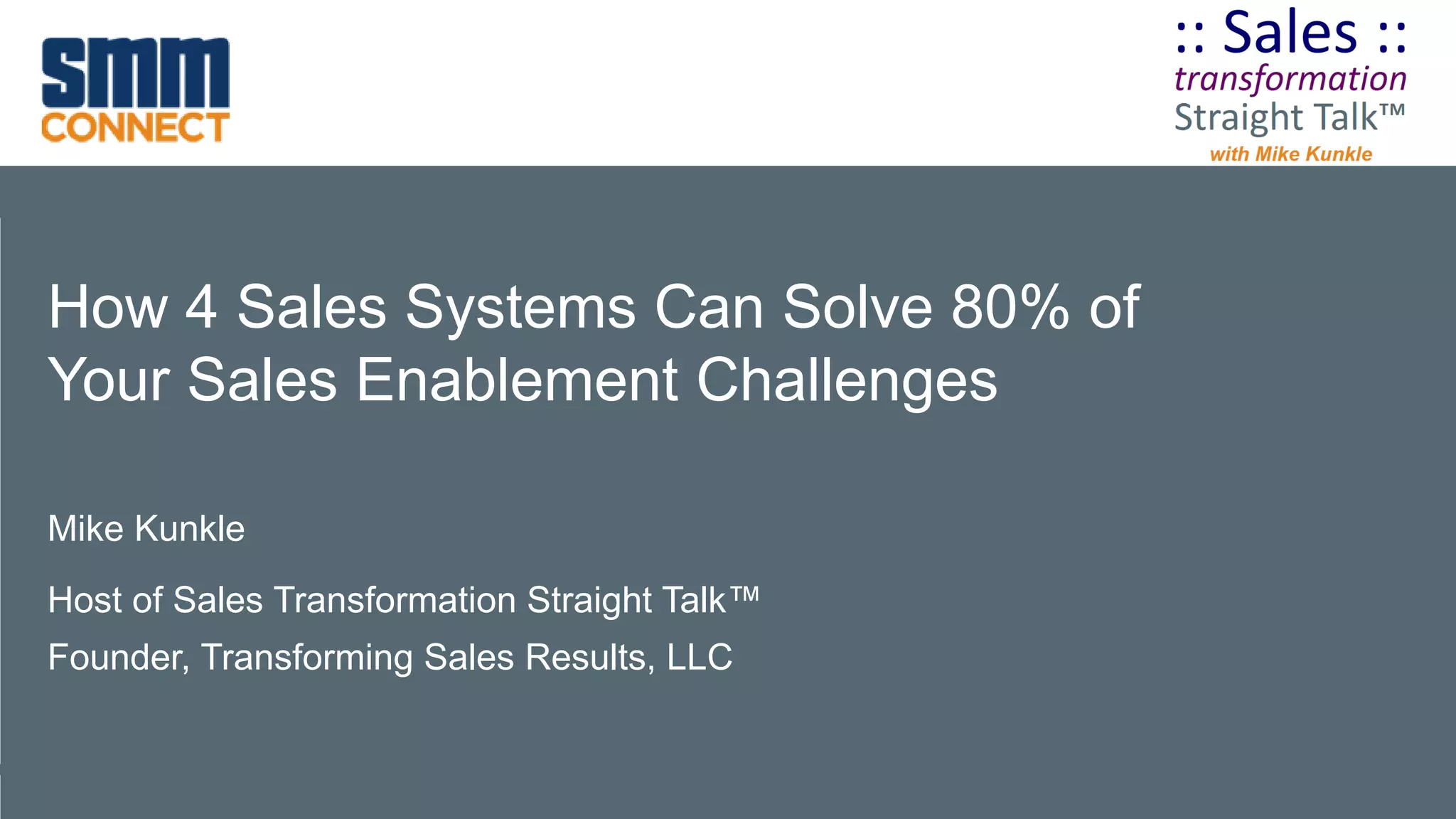 The document outlines a webinar series hosted by Mike Kunkle that focuses on transforming sales results through effective sales enablement strategies. It discusses four sales systems that can address common sales enablement challenges, significantly improving performance metrics such as new-hire ramp-up time, sales productivity, and revenue growth. Kunkle emphasizes a holistic approach to sales enablement, integrating technology, processes, and training to foster impactful sales transformation.