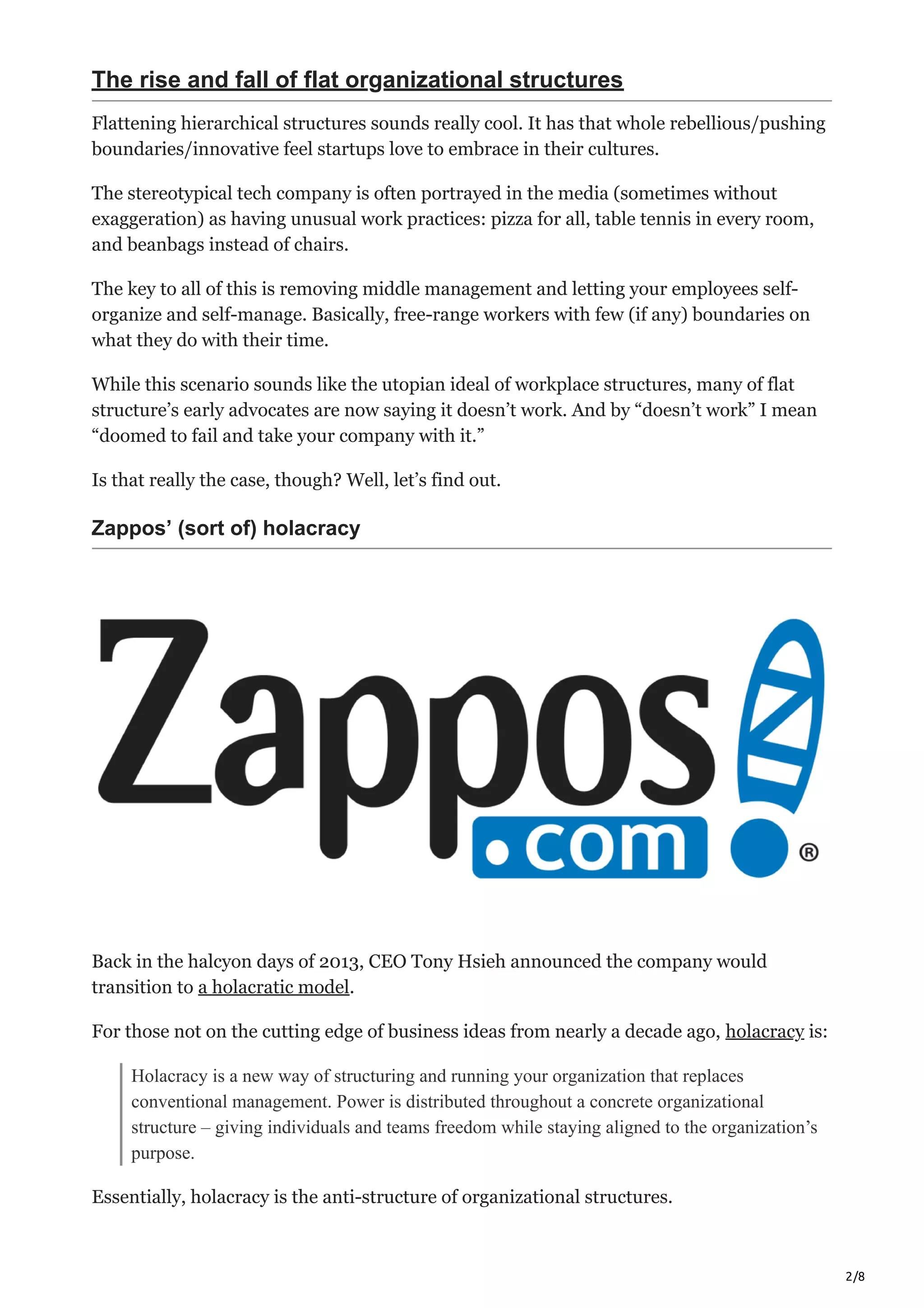 - Zappos initially adopted a holacratic structure but later reintroduced some hierarchy due to implementation challenges.