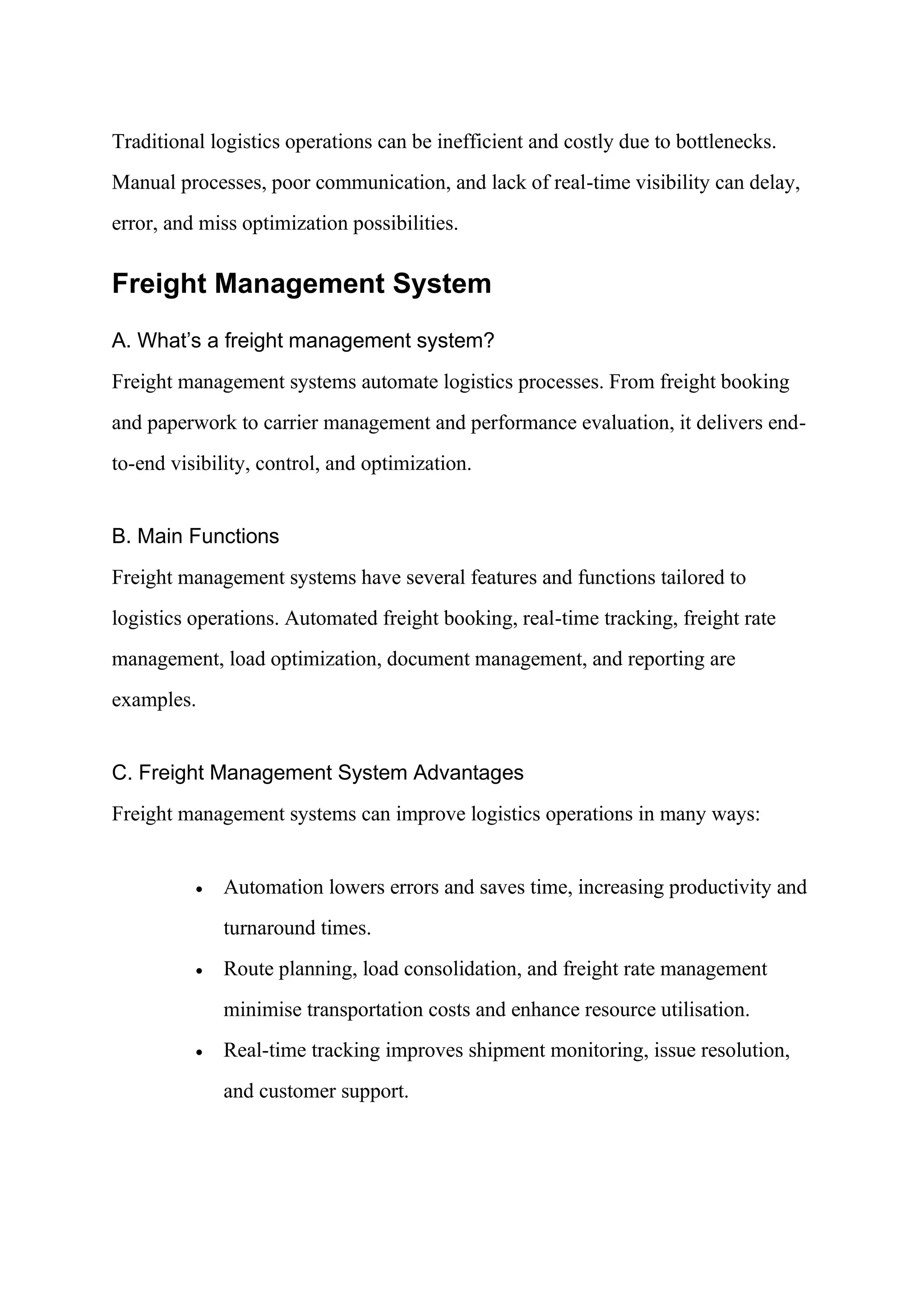 A freight management system enhances logistics operations by automating processes such as freight booking, tracking, and documentation, leading to improved efficiency and reduced costs. It provides features like real-time tracking, load optimization, and enhanced communication among stakeholders, which drives productivity and customer satisfaction. Implementing such a system allows businesses to optimize resources, make data-driven decisions, and ultimately boost their competitive edge in the logistics industry.