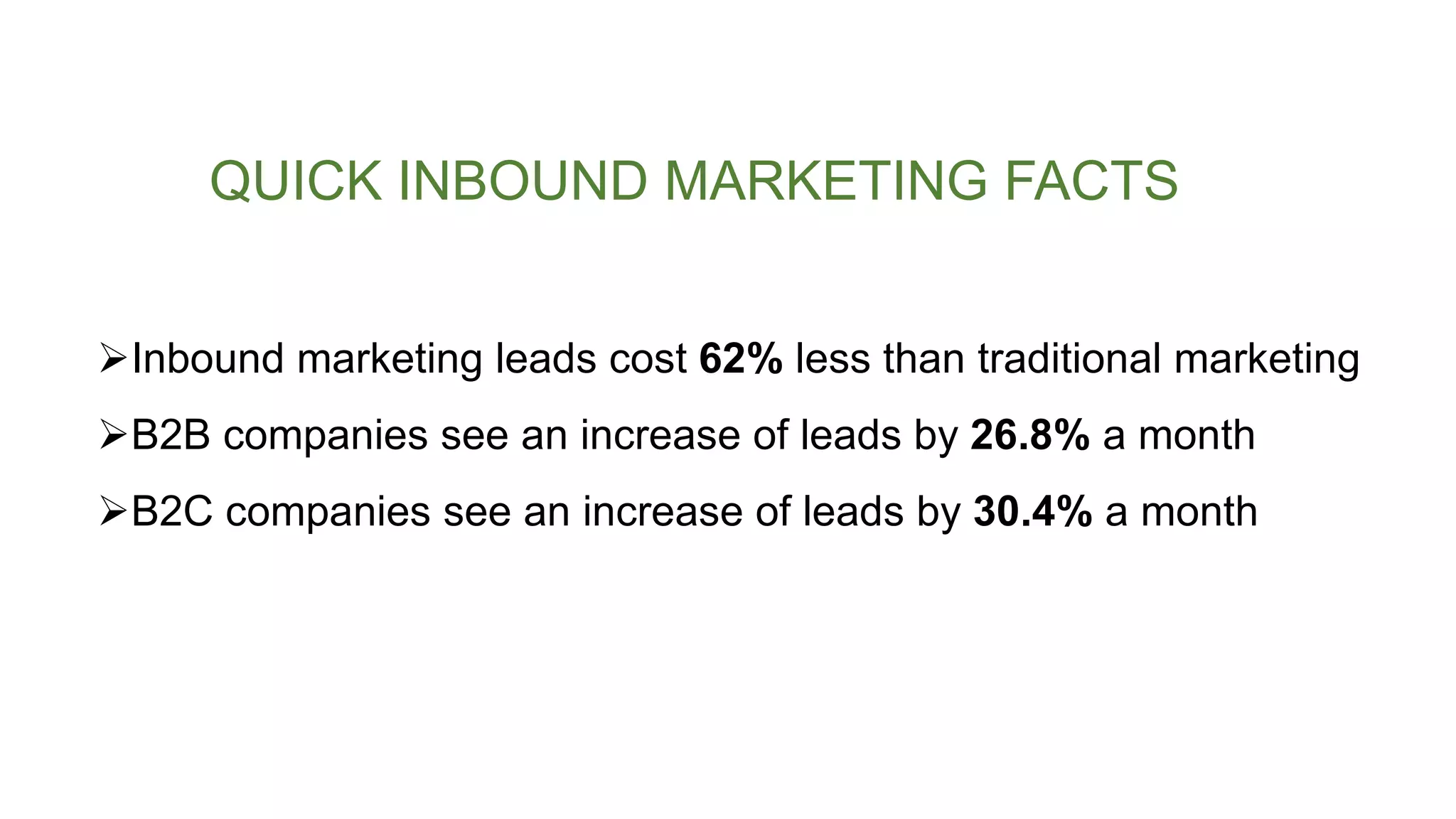 Inbound marketing uses content and search engine optimization to attract and convert website visitors into qualified leads. The process begins when a searcher finds helpful content on Google that addresses their question. Interested visitors who click through to the website and provide their contact information become informed leads for businesses to follow up with. When done effectively through blogs, landing pages, and calls to action, inbound marketing can lower costs and increase qualified leads compared to traditional marketing methods.