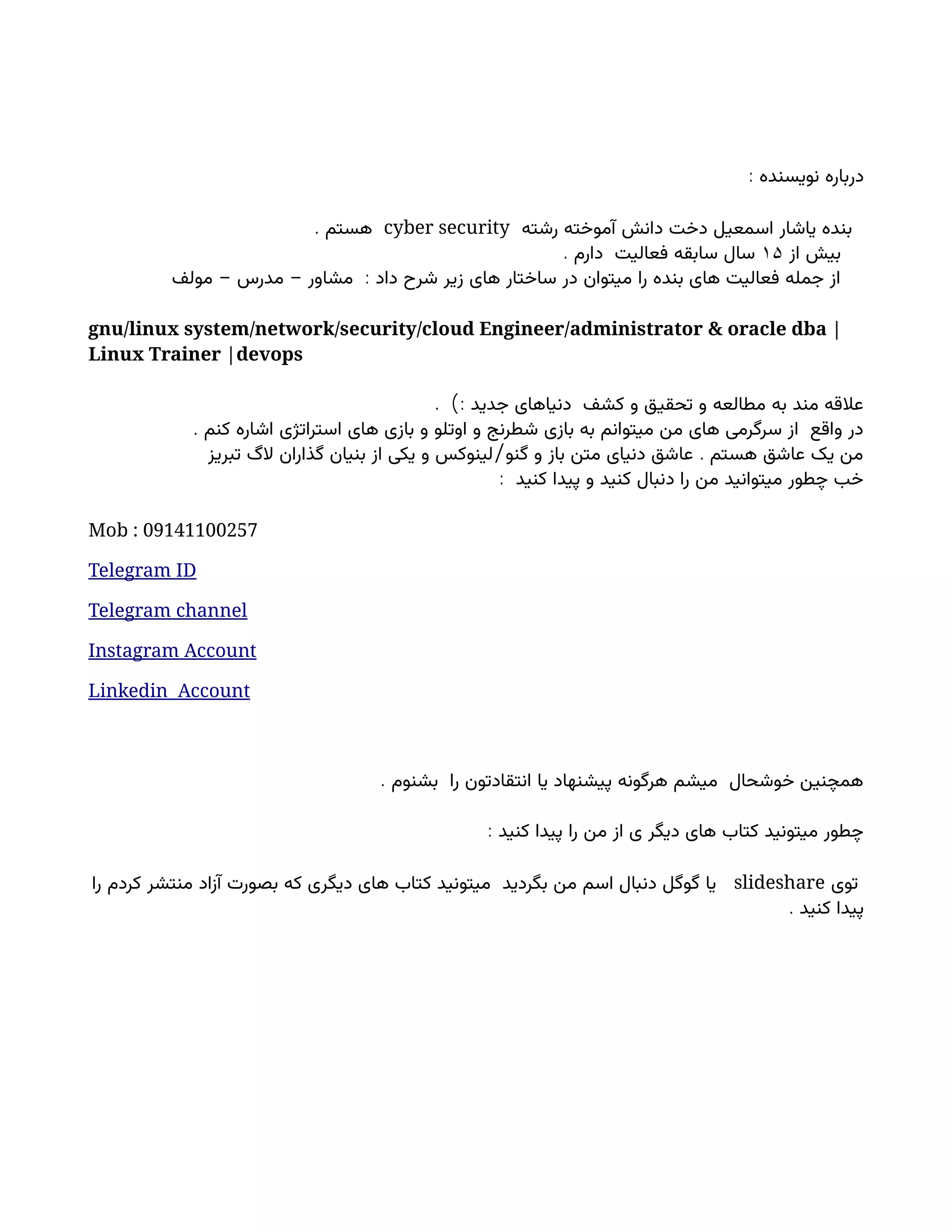 آموخته دانش دخت اسمعیل یاشار بنده cyber security . هستم از بیش ۱۵ . دارم فعالیت سابقه سال - - : مولف مدرس مشاور داد شرح زیر های ساختار در میتوان را بنده های فعالیت جمله از gnu/linux system/network/security/cloud Engineer/administrator & oracle dba | Linux Trainer |devops . ): جدید دنیاهای کشف و تحقیق و مطالعه به مند عالقه . کنم اشاره استراتژی های بازی و اوتلو و شطرنج بازی به میتوانم من های سرگرمی از واقع در / . تبریز الگ گذاران بنیان از یکی و لینوکس گنو و باز متن دنیای عاشق هستم عاشق یک من : کنید پیدا و کنید دنبال را من میتوانید چطور خب Mob : 09141100257 Telegram ID Telegram channel Instagram Account Linkedin Account . بشنوم را انتقادتون یا پیشنهاد هرگونه میشم خوشحال همچنین : کنید پیدا را من از ی دیگر های کتاب میتونید چطور توی slideshare را کردم منتشر آزاد بصورت که دیگری های کتاب میتونید بگردید من اسم دنبال گوگل یا . کنید پیدا
