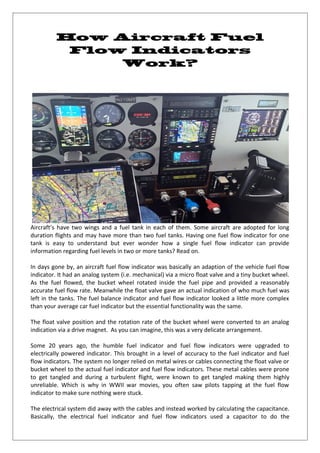 Aircraft fuel flow indicators monitor fuel levels in one or more tanks, evolving from mechanical systems to electric and finally to digital systems for increased accuracy. Modern systems use electronic data management to measure fuel flow and levels, providing information on distance-to-empty and other metrics. J.P. Instruments is a leading manufacturer of advanced fuel indicators in the U.S.