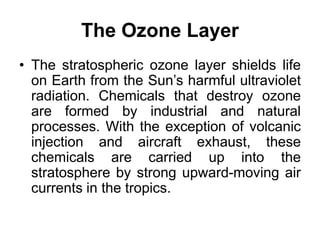 Methane and CFCs both contribute to ozone depletion and global warming. Methane is a potent greenhouse gas that is 21 times more harmful than carbon dioxide. It reacts with chlorine in the stratosphere, protecting ozone, but also attacks ozone directly. CFCs destroy ozone by releasing chlorine atoms when exposed to UV radiation, which then break down ozone molecules. While CFCs have been phased out under the Montreal Protocol, methane emissions continue from sources such as livestock, landfills, and fossil fuel extraction. Both gases trap heat in the atmosphere and are contributing to rising global temperatures.