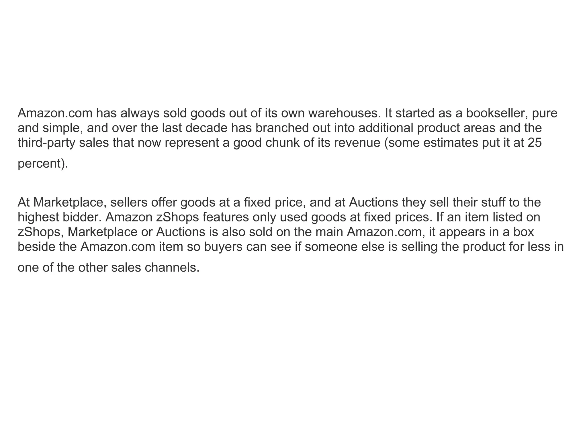 Amazon sells goods both directly from its warehouses and through third-party sellers on its Marketplace, Auctions, and zShops platforms. It features over 9 million square feet of warehouse space globally to store and fulfill orders. Amazon also personalizes the customer experience by providing recommendations tailored to individual buyers based on their browsing history.