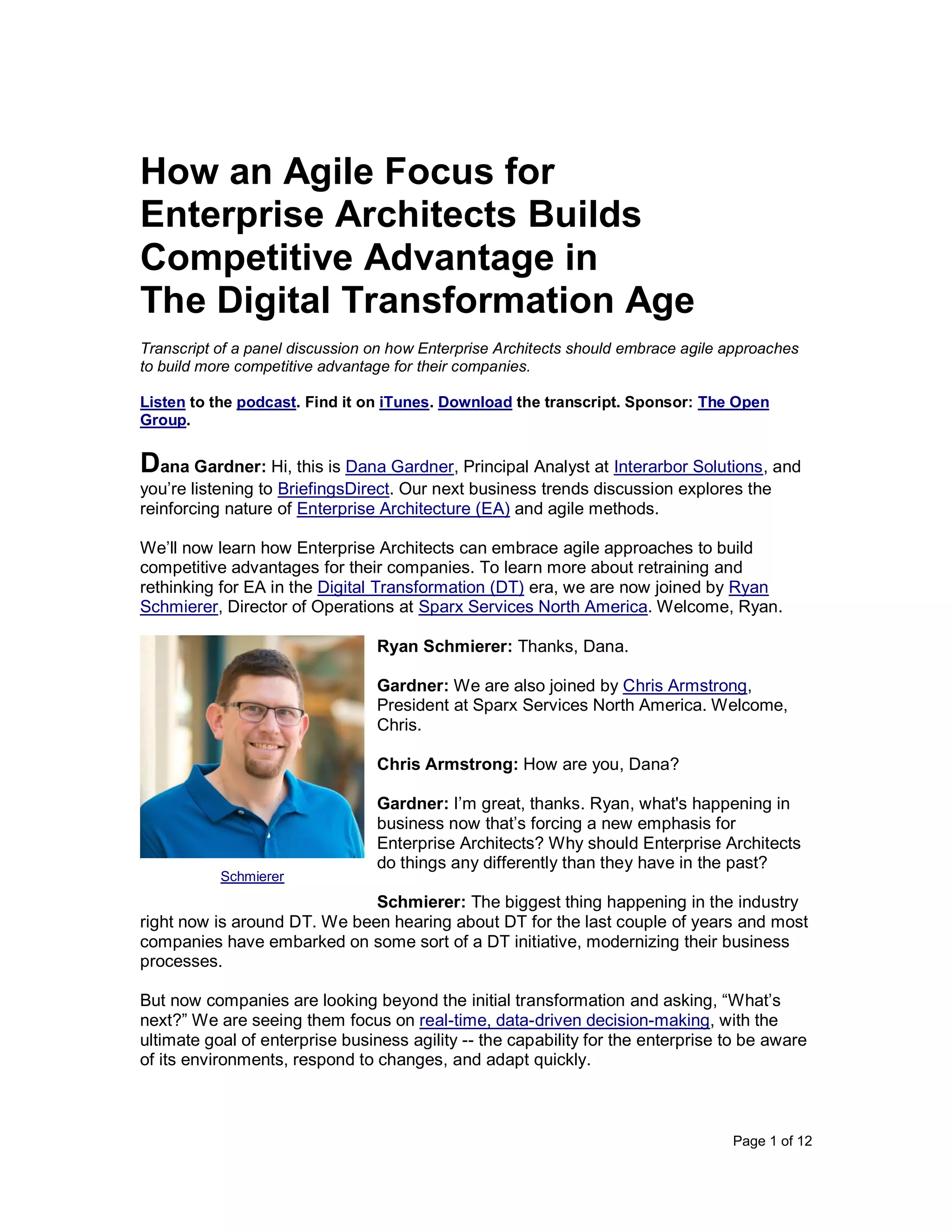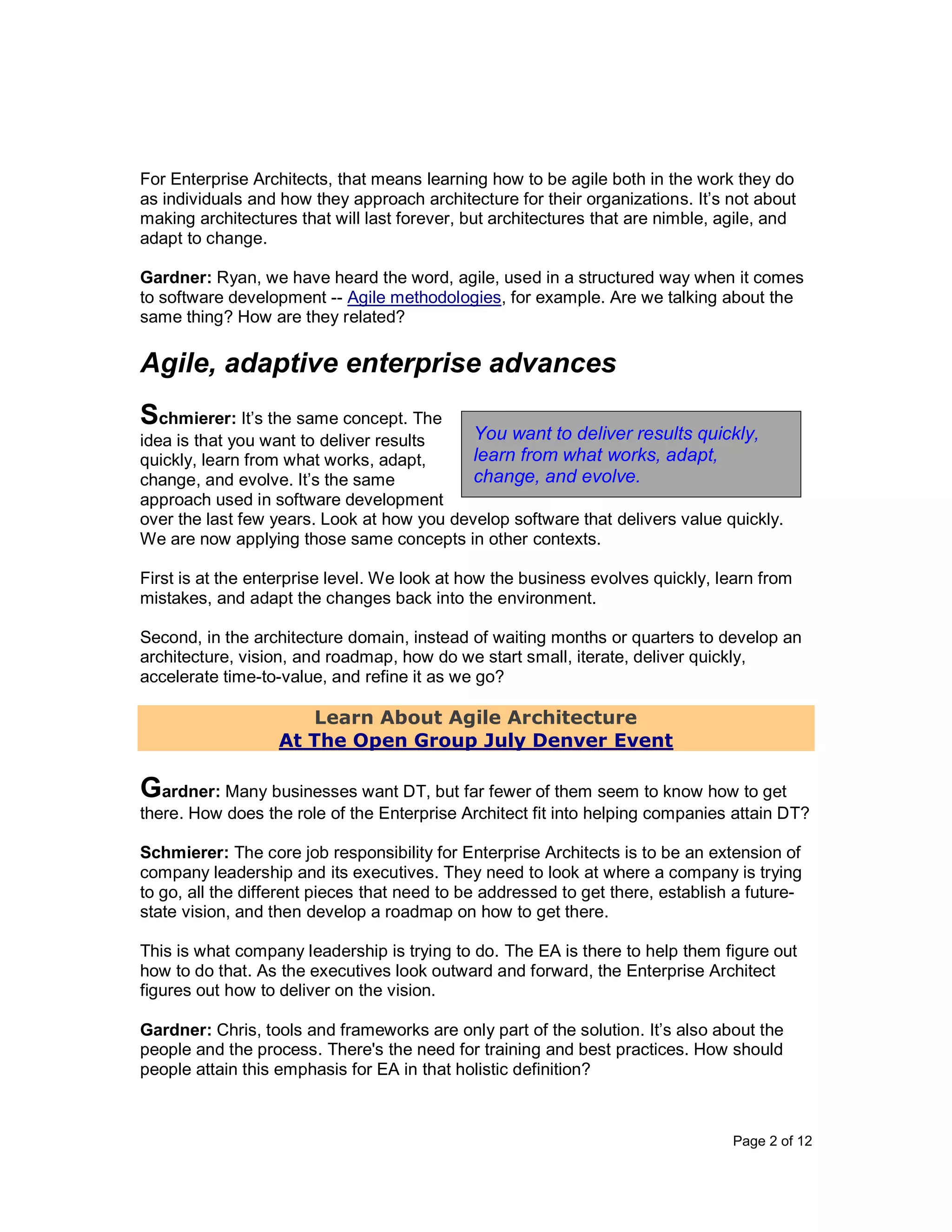 The document discusses a panel discussion on how enterprise architects can adopt agile approaches to enhance their organizations' competitive advantages during digital transformation (DT). Key points include the importance of agility in enterprise architecture, integrating business and IT processes, and adapting frameworks like TOGAF to maintain relevance. It emphasizes the need for enterprise architects to focus on present challenges and foster a holistic understanding of technology to support evolving business environments.