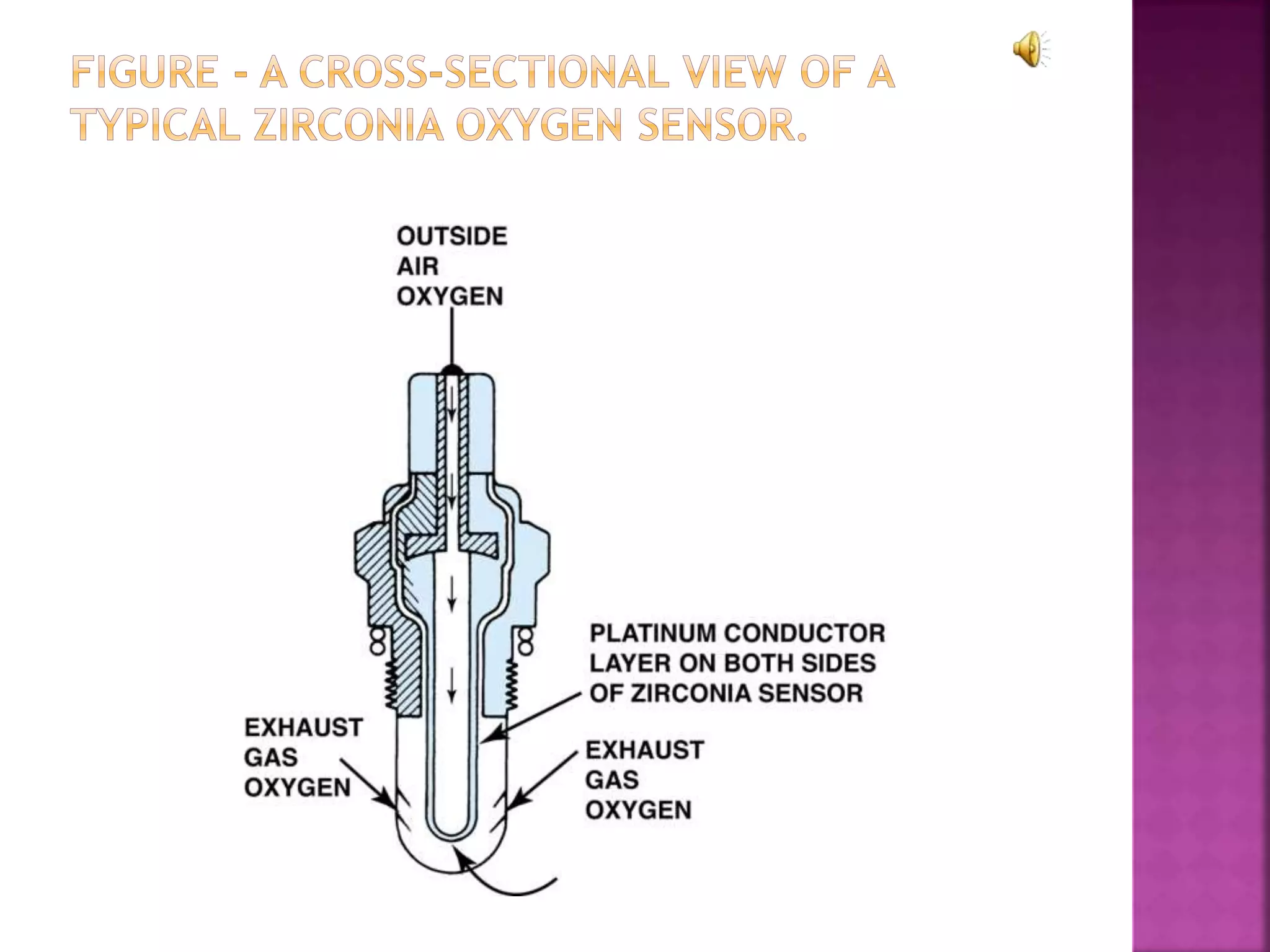 The front sensing element consists of zirconium dioxide within a steel shell connected to platinum electrodes.