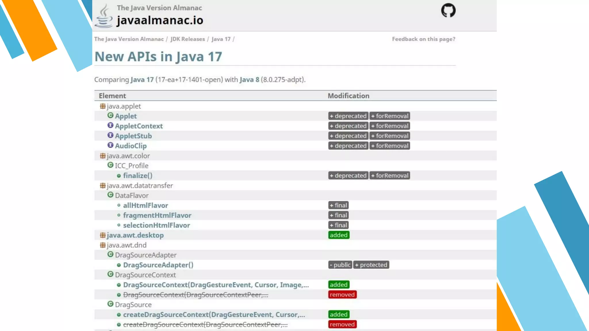 Highlighting Java 17's deprecations, including the Applet API and other features.
