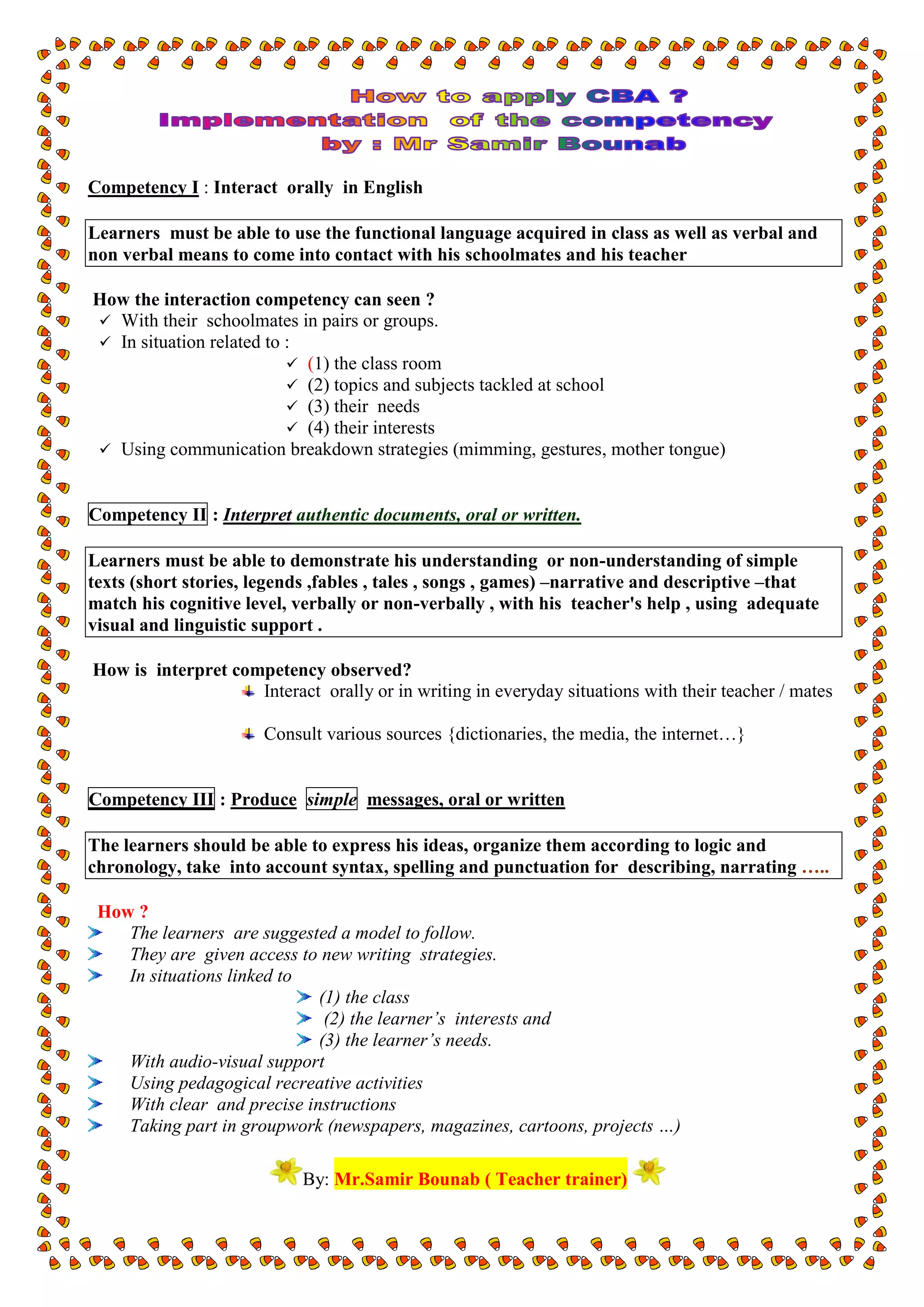 This document outlines three competencies for English language learners: 1) Interact orally in English with schoolmates and teachers in classroom situations, on various topics and needs, using gestures and their native language if needed. 2) Interpret simple oral and written texts like stories, songs, and games that match their cognitive level, demonstrating understanding verbally or non-verbally with teacher support. 3) Produce simple oral and written messages by expressing and organizing ideas with proper syntax, spelling, and punctuation for descriptions and narratives, using models, writing strategies, classroom situations, interests, needs, and activities like group projects.