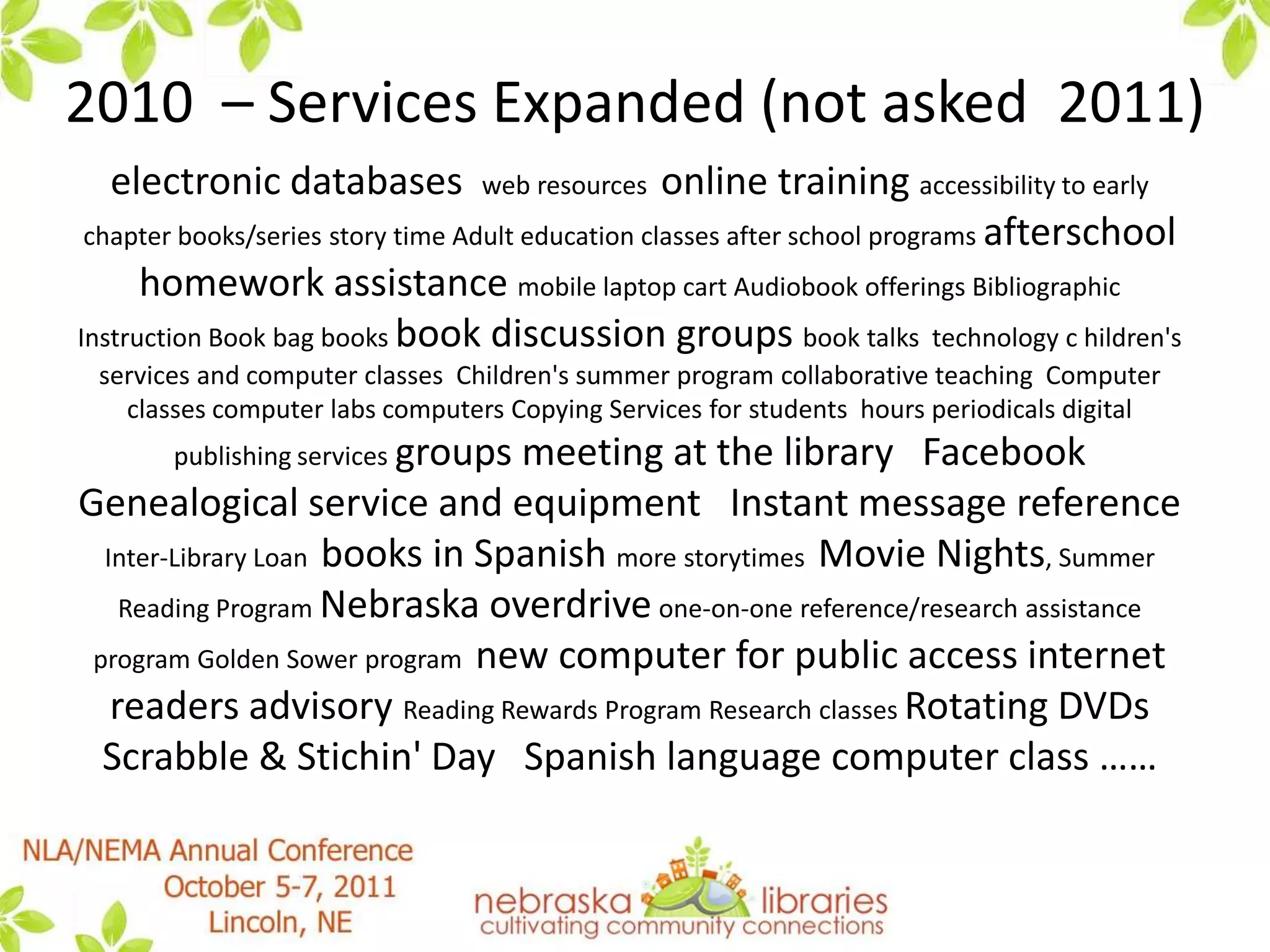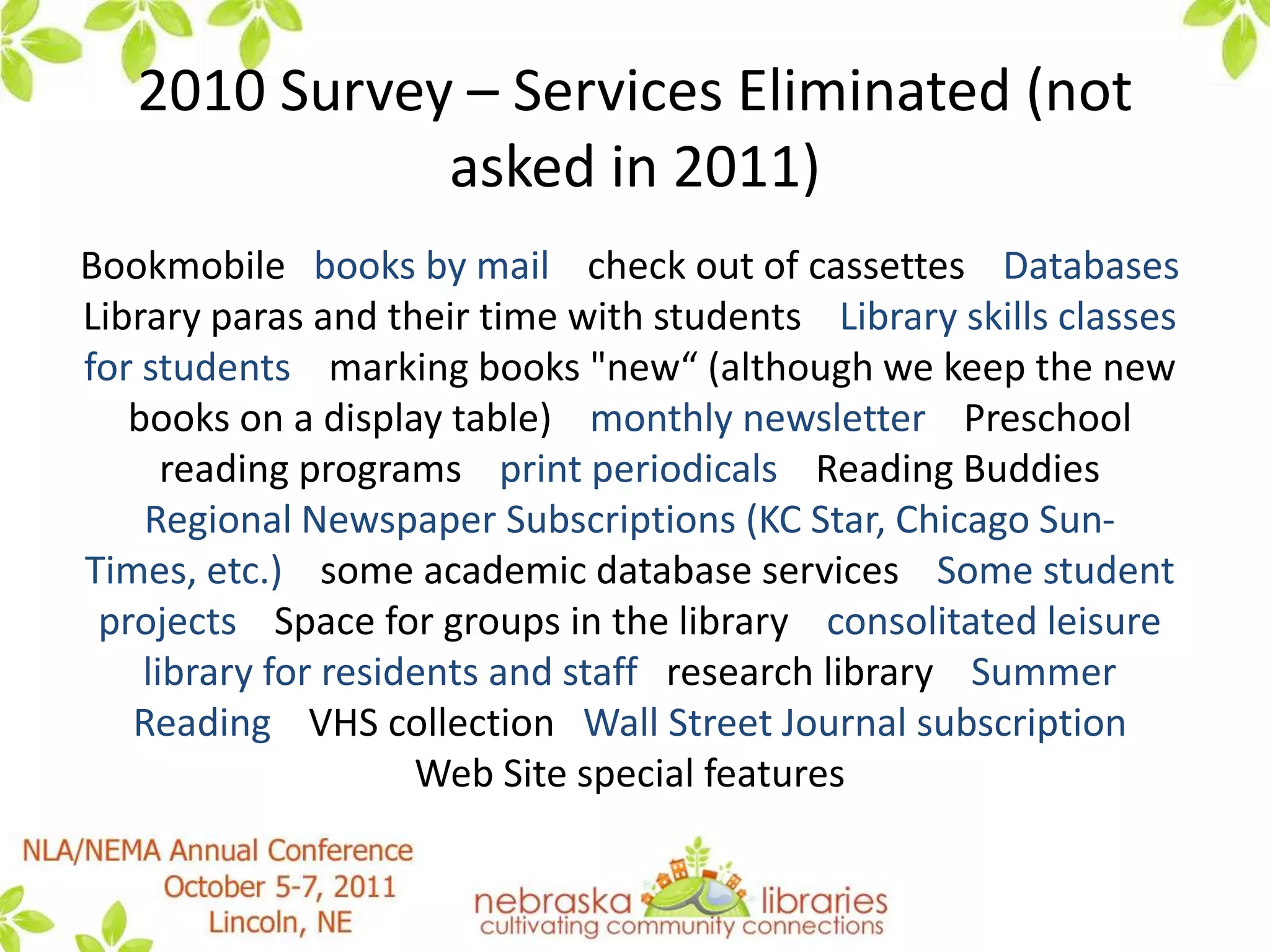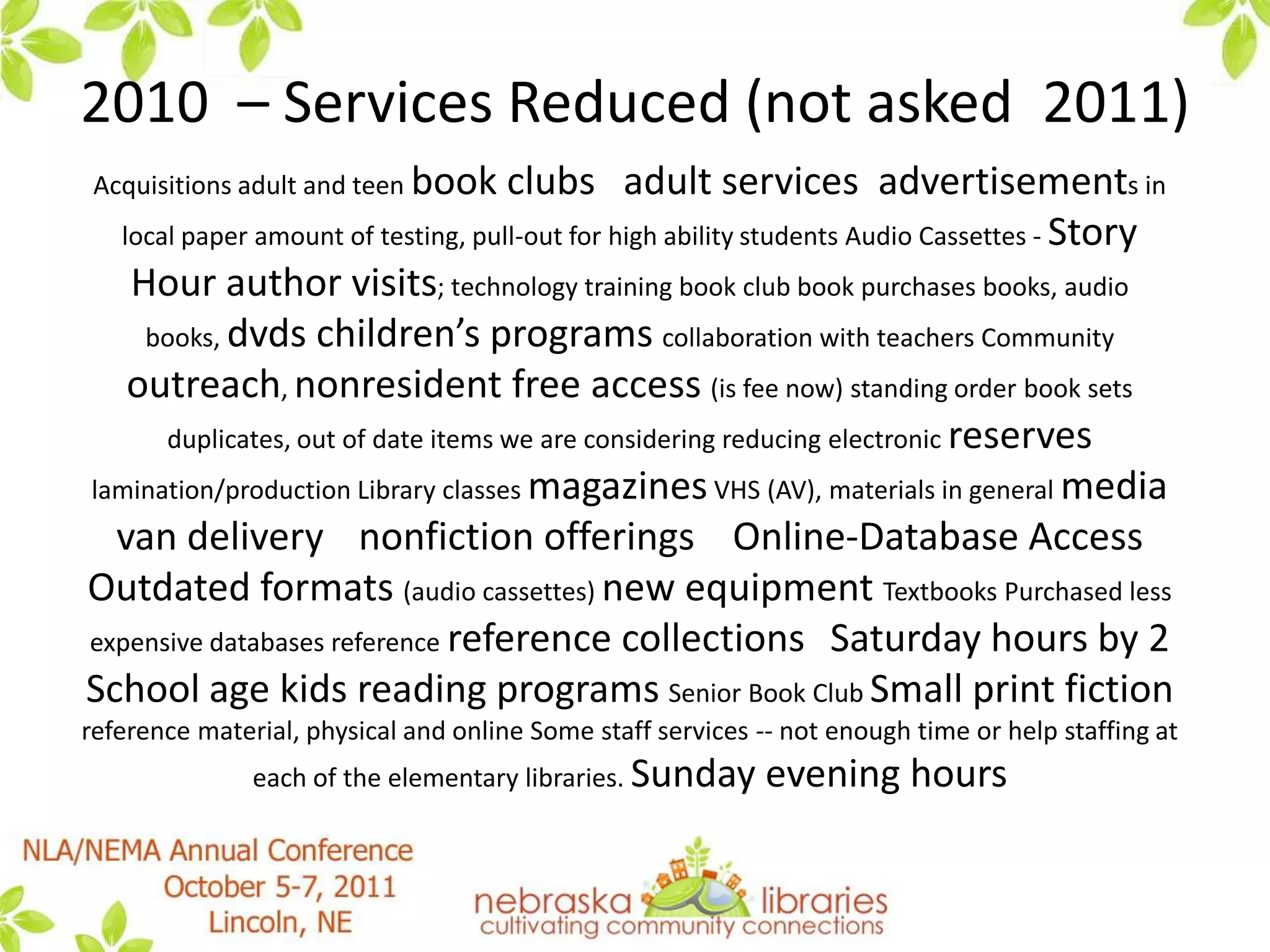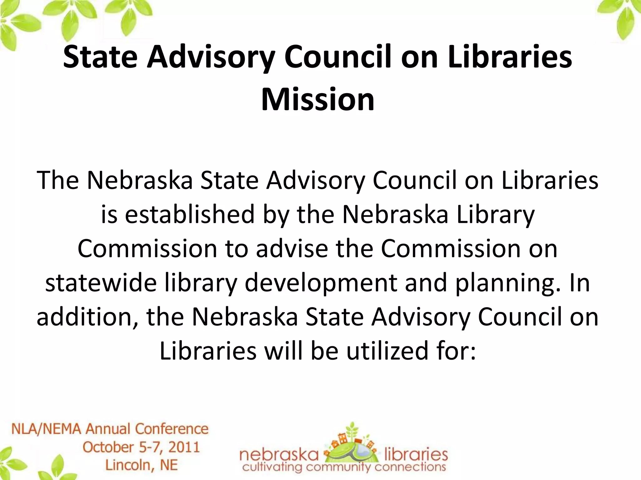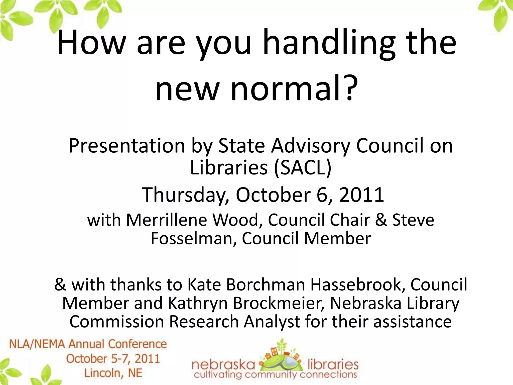 This document summarizes a presentation by the State Advisory Council on Libraries (SACL) about how libraries in Nebraska are handling "the new normal" brought about by tough economic times. It discusses results from SACL surveys in 2010 and 2011 that found many libraries had to reduce services, materials budgets, and hours in response to lower budgets. However, it notes that Nebraska has fared better than many other states. The presentation discusses strategies discussed by SACL for guiding libraries through these challenges, such as focusing on essential services, increased technology use, collaboration, and advocacy. It provides several resources for further reading on this topic.