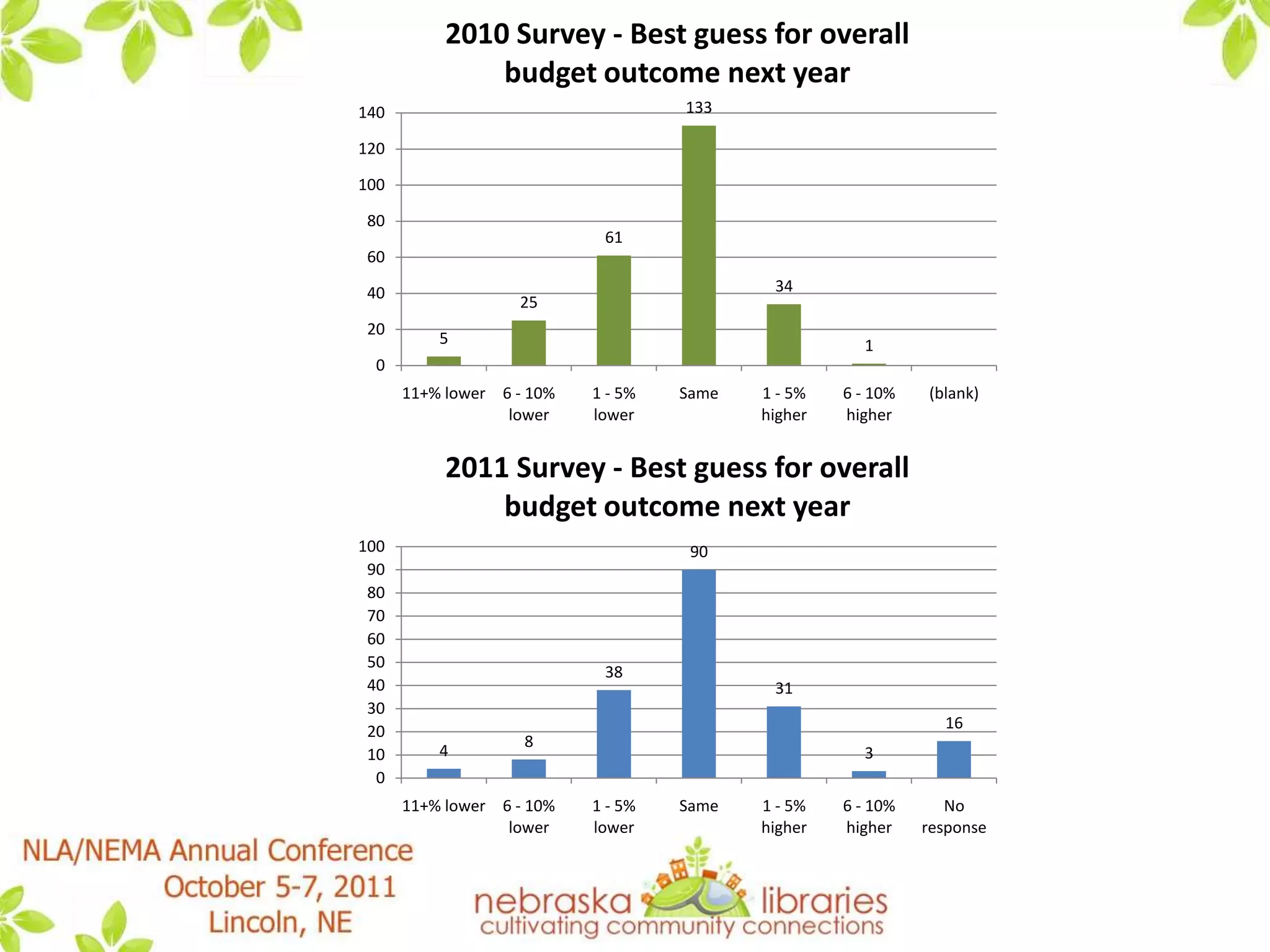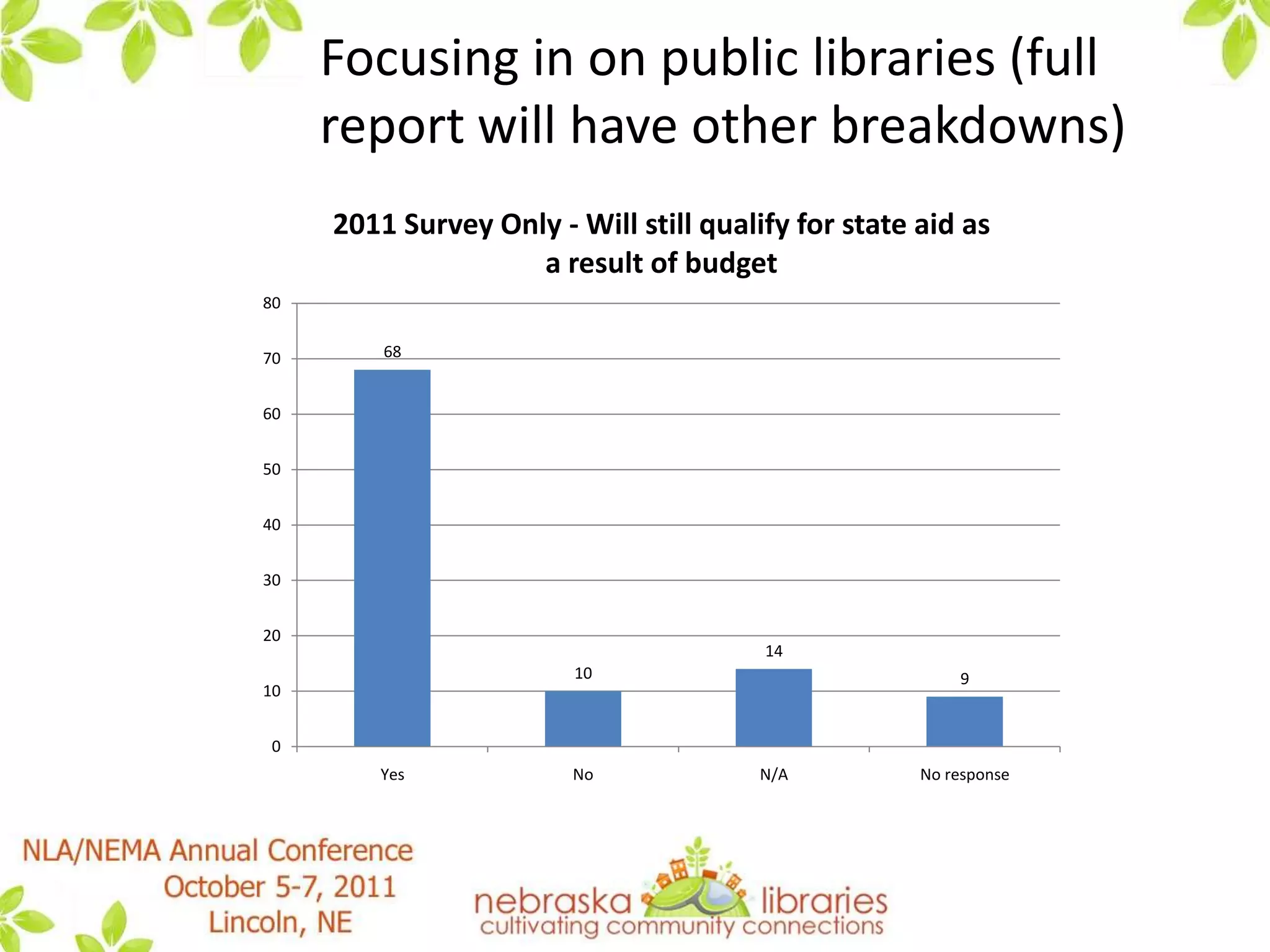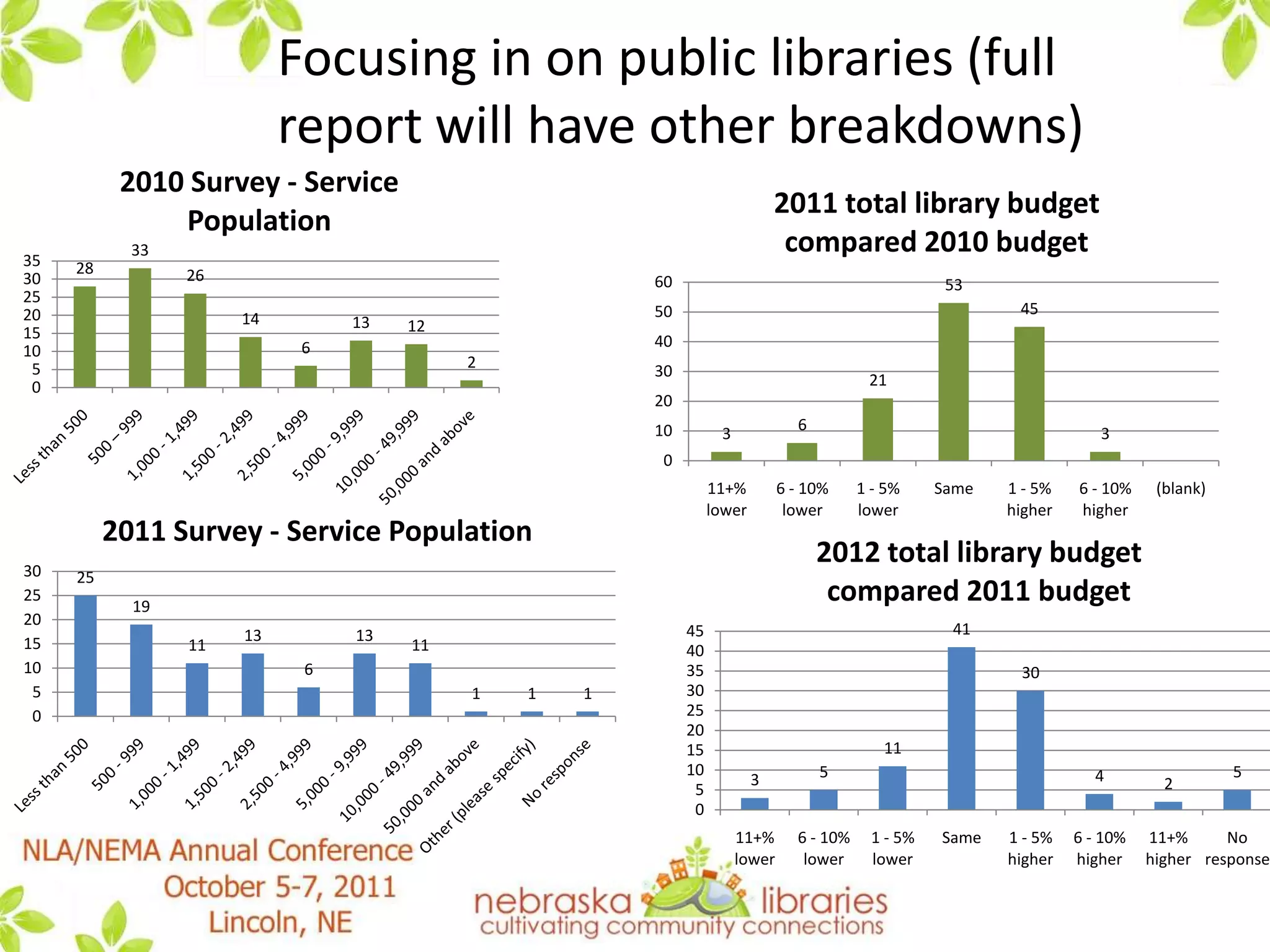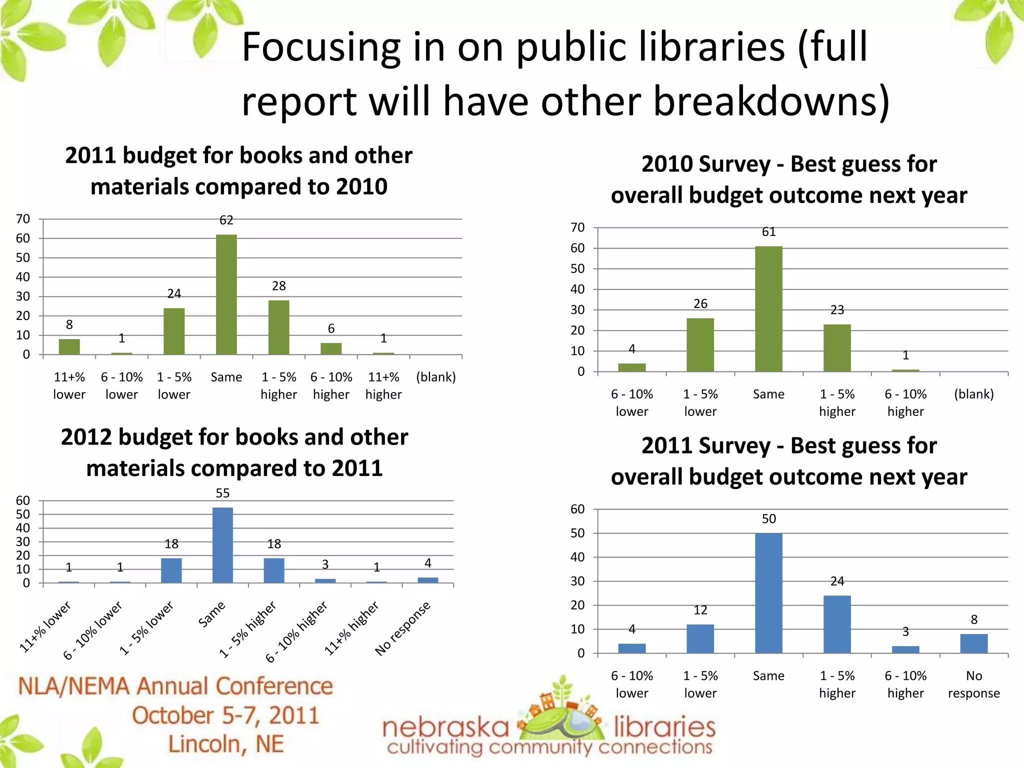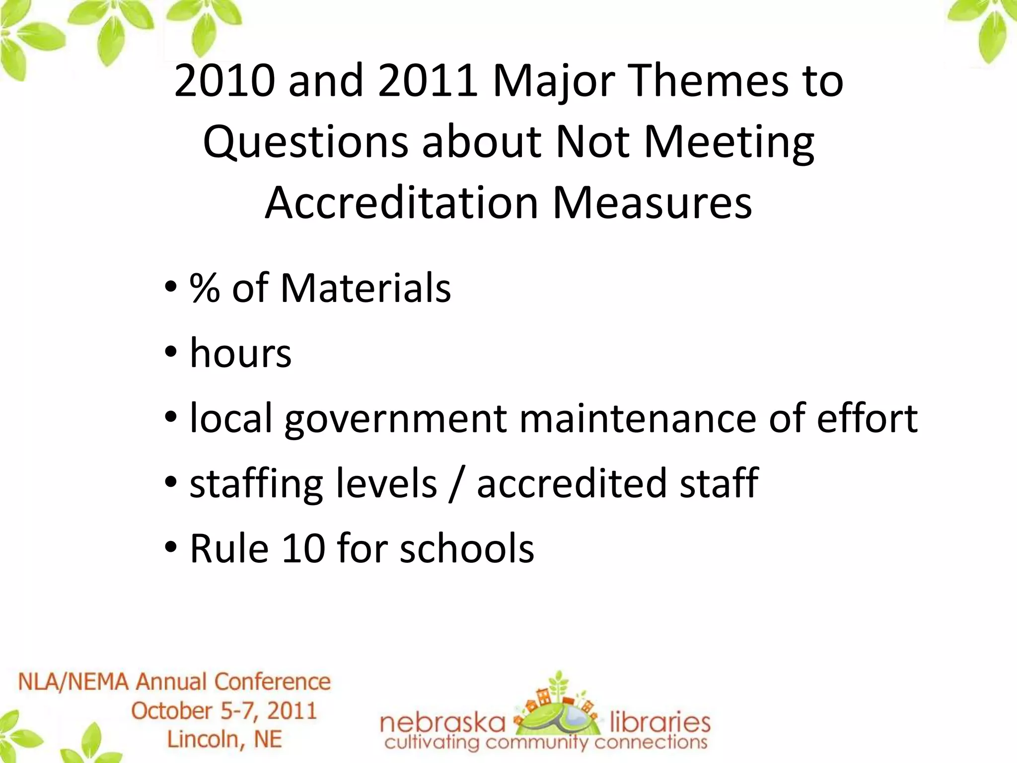 This document summarizes a presentation by the State Advisory Council on Libraries (SACL) about how libraries in Nebraska are handling "the new normal" brought about by tough economic times. It discusses results from SACL surveys in 2010 and 2011 that found many libraries had to reduce services, materials budgets, and hours in response to lower budgets. However, it notes that Nebraska has fared better than many other states. The presentation discusses strategies discussed by SACL for guiding libraries through these challenges, such as focusing on essential services, increased technology use, collaboration, and advocacy. It provides several resources for further reading on this topic.