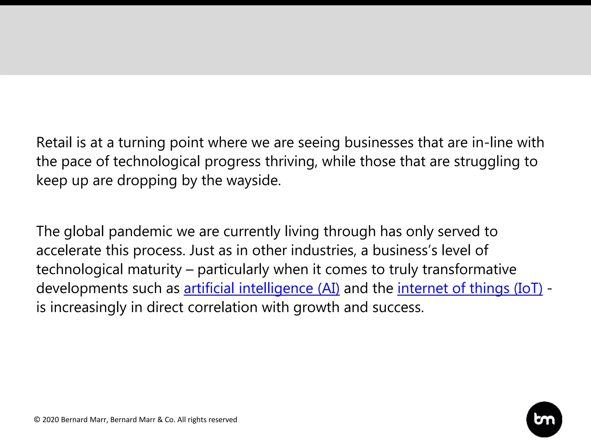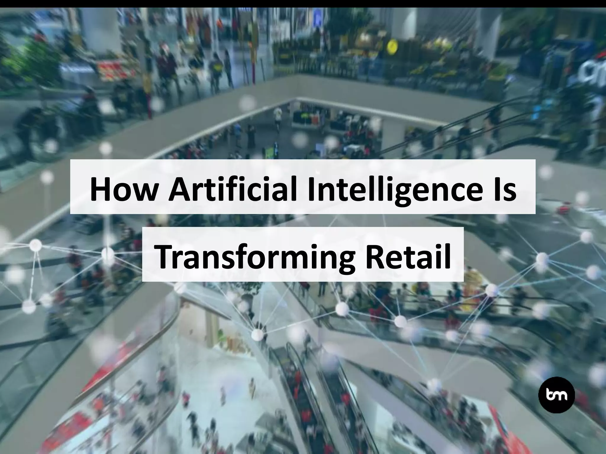 The document discusses the transformative impact of artificial intelligence (AI) on the retail industry, especially in light of the global pandemic, which has accelerated technological adoption. Key areas of AI implementation include theft prevention through computer vision, intelligent warehousing, and optimized last-mile delivery, contributing to significant cost savings and operational efficiency. Furthermore, the evolution towards cashier-less stores and enhanced customer experiences through extended reality technologies reflects the ongoing digital transformation in retail.