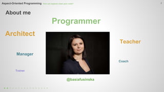 This document discusses aspect-oriented programming and how aspects can be used to clean up code by encapsulating cross-cutting concerns. It provides examples of common cross-cutting concerns like logging, validation, and transactions. The presenter explains what aspects are and how they work, including different types of advices. Demonstrations are provided to show refactoring code to use aspects and testing aspects. The overall message is that aspects promote cleaner, more reusable code by separating cross-cutting concerns from the main code logic.