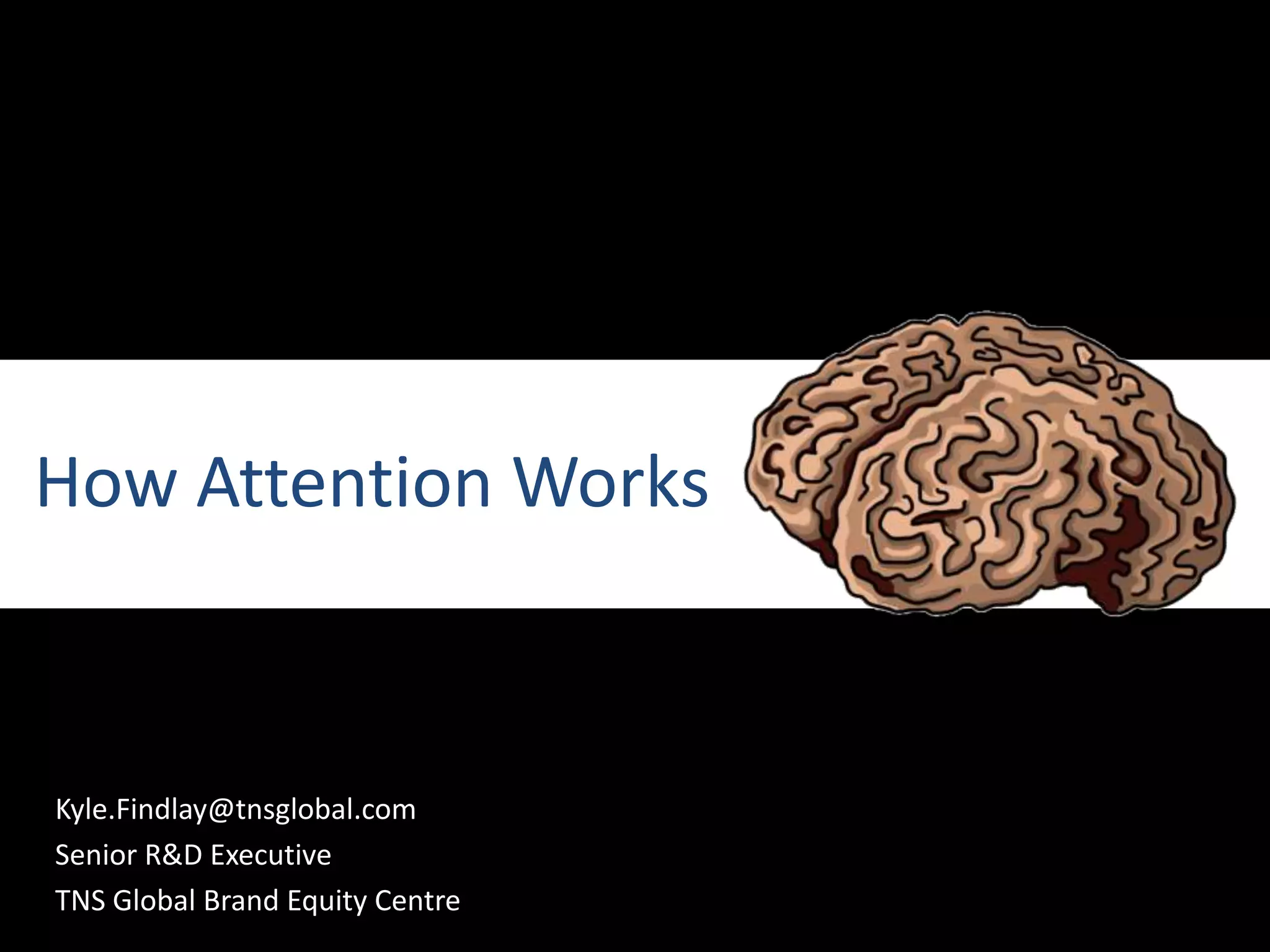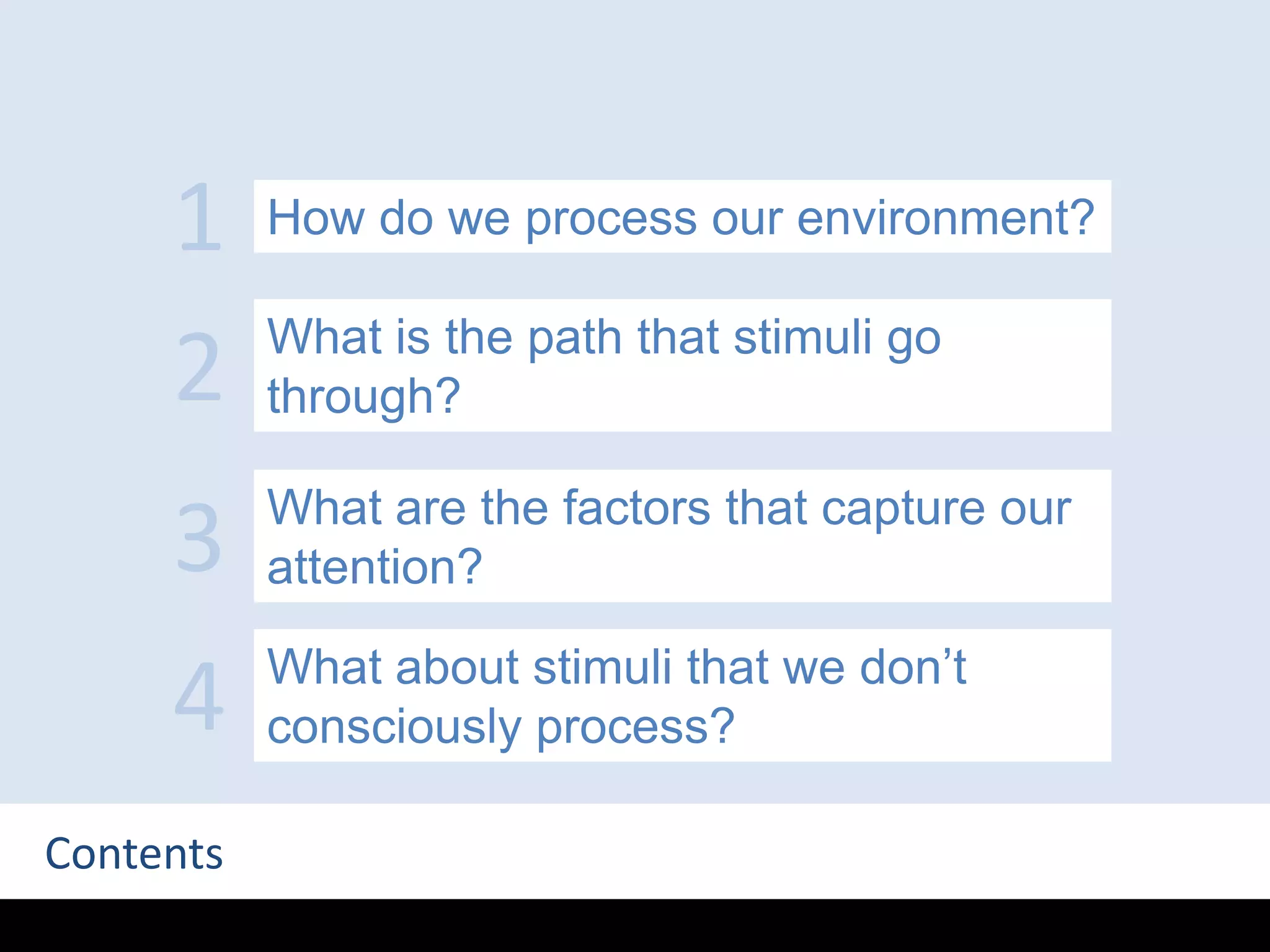 The document discusses the mechanisms of attention, focusing on how stimuli are processed through various stages including pre-conscious processing and short-term memory capacity. It highlights factors that capture attention such as emotional charge, contrast, and social cues, while explaining both conscious and unconscious processing of stimuli. The complexity of human attention is explored through concepts like attentional bottlenecks and load theory, emphasizing the subjective nature of perception.