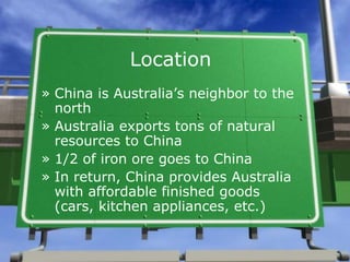 Australia exports many natural resources, especially iron ore and coal, to China. China provides finished goods in return and is also a leading source of international tourists to Australia due to its proximity. Australia's mining industry is a major part of its economy, with the country being the top exporter of resources like iron ore, coal, bauxite, and diamonds. Gold mining attracted many immigrants in the 1800s.
