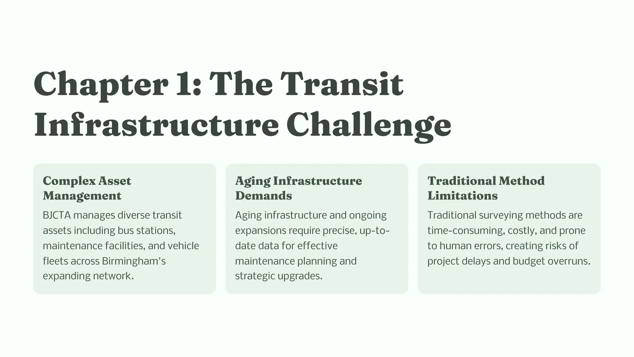 Discover how the Birmingham-Jefferson County Transit Authority (BJCTA) can leverage cutting-edge 3D laser scanning technology to enhance infrastructure management, streamline transit system upgrades, and improve operational efficiency. This comprehensive guide explores the applications of high-precision 3D scanning in asset documentation, facility modernization, and safety compliance. Learn how advanced scanning solutions can reduce project costs, minimize errors, and provide accurate as-built data for better planning and decision-making in public transportation projects.