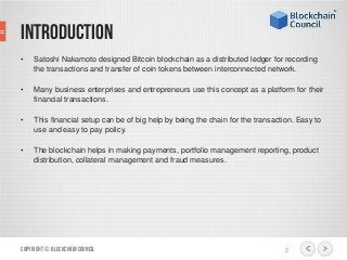designed Bitcoin blockchain as a distributed ledger for recording the transactions and transfer of coin tokens between interconnected network. • Many business enterprises and entrepreneurs use this concept as a platform for their financial transactions. • This financial setup can be of big help by being the chain for the transaction. Easy to use and easy to pay policy. • The blockchain helps in making payments, portfolio management reporting, product distribution, collateral management and fraud measures. Copyright© BlockchainCouncil 2
