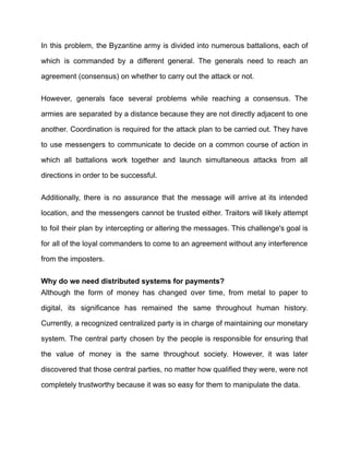 The document explains how blockchain technology addresses the Byzantine Generals Problem, a key challenge in decentralized systems, by enabling consensus without a trusted central authority. It describes how blockchain uses consensus algorithms like proof-of-work and cryptography to ensure secure and reliable communication among network nodes, allowing for trustless transactions. Additionally, it emphasizes the importance of Byzantine Fault Tolerance to maintain a functioning network amid potential corrupt actors.
