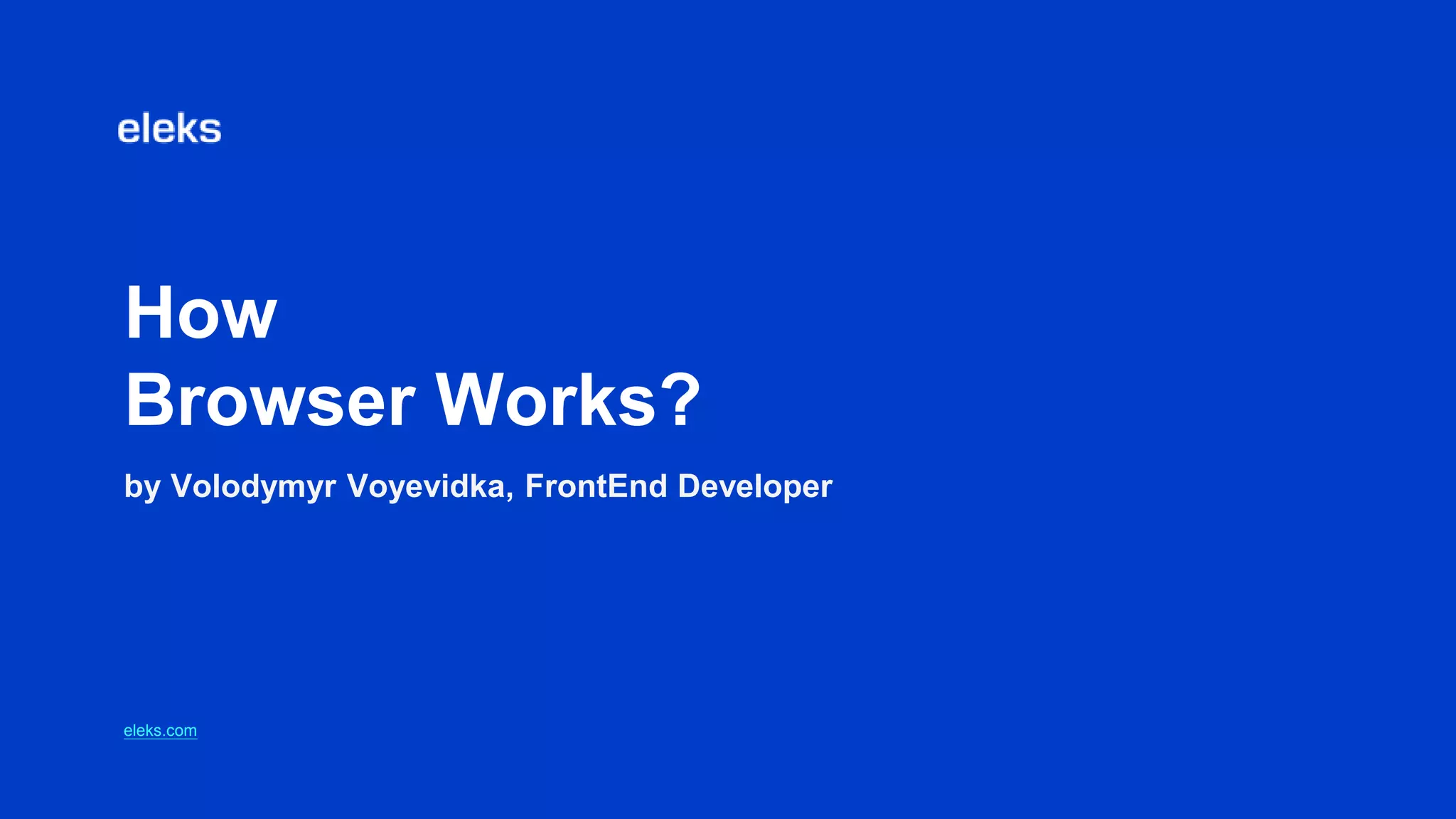 The document provides an overview of how a browser works by breaking it down into key components and subcomponents. It discusses the user interface, browser engine, rendering engine, networking, JavaScript interpreter, UI backend, data persistence, and web APIs that make up a browser. It then dives deeper into specific subcomponents like the HTML parser, CSS parser, DOM, rendering tree, layout and reflow process, and event loop. The document uses diagrams and examples to illustrate how each component interacts and the main flows and processes involved in rendering web content in the browser.