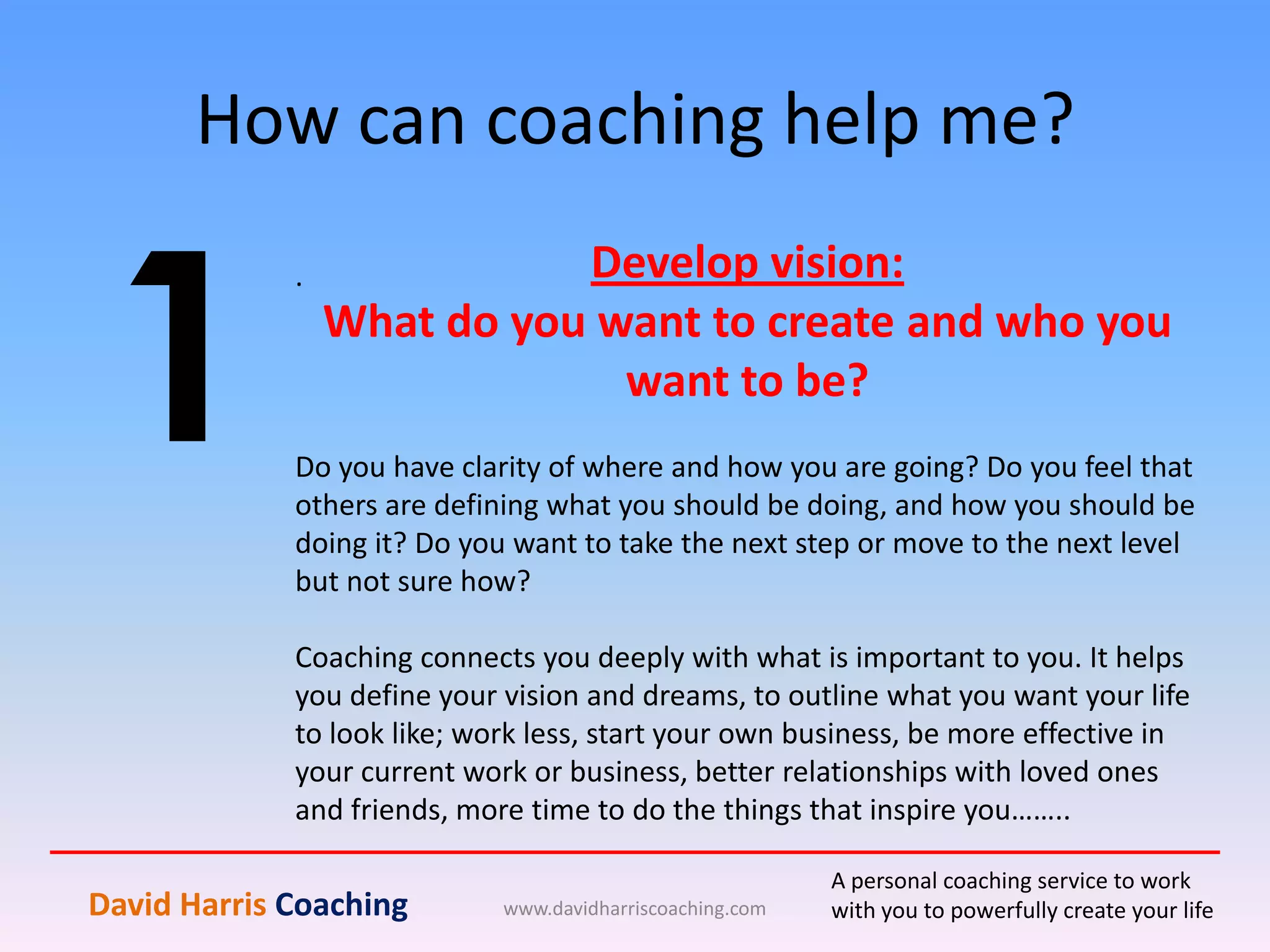 David Harris Coaching offers personal coaching services aimed at helping individuals create their desired life through various methods, including developing vision, expanding choices, initiating action, and increasing self-awareness. The coaching process is designed to align personal values with actions, leading to a more fulfilling life. Interested individuals can contact David for a free 30-minute discussion to explore their specific needs.