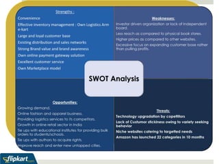 The document provides an analysis of India's e-commerce industry with a focus on Flipkart, highlighting its growth, market share, and competitive strategies against players like Amazon and Snapdeal. It discusses the challenges faced by the e-commerce sector, such as logistics issues and high return rates, while detailing Flipkart's unique value propositions and operational strategies. Recommendations for enhancing customer loyalty and market position are also included, emphasizing the importance of optimizing brand experiences.