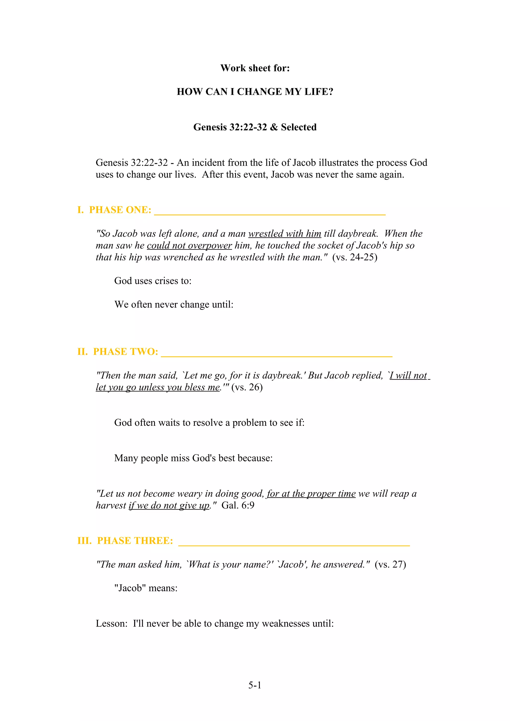 The document describes Jacob's encounter with God where he wrestled with a man until daybreak. It outlines this event in four phases: (1) God uses crises to change our lives when we are alone; (2) God waits to see if we persist in our faith when problems remain unresolved; (3) Jacob's name means deceiver, and we must acknowledge our weaknesses to change; (4) Jacob's name was changed to Israel because he struggled with God and men and overcame, and he walked with a limp as a reminder that he saw God face to face and of his transformation.