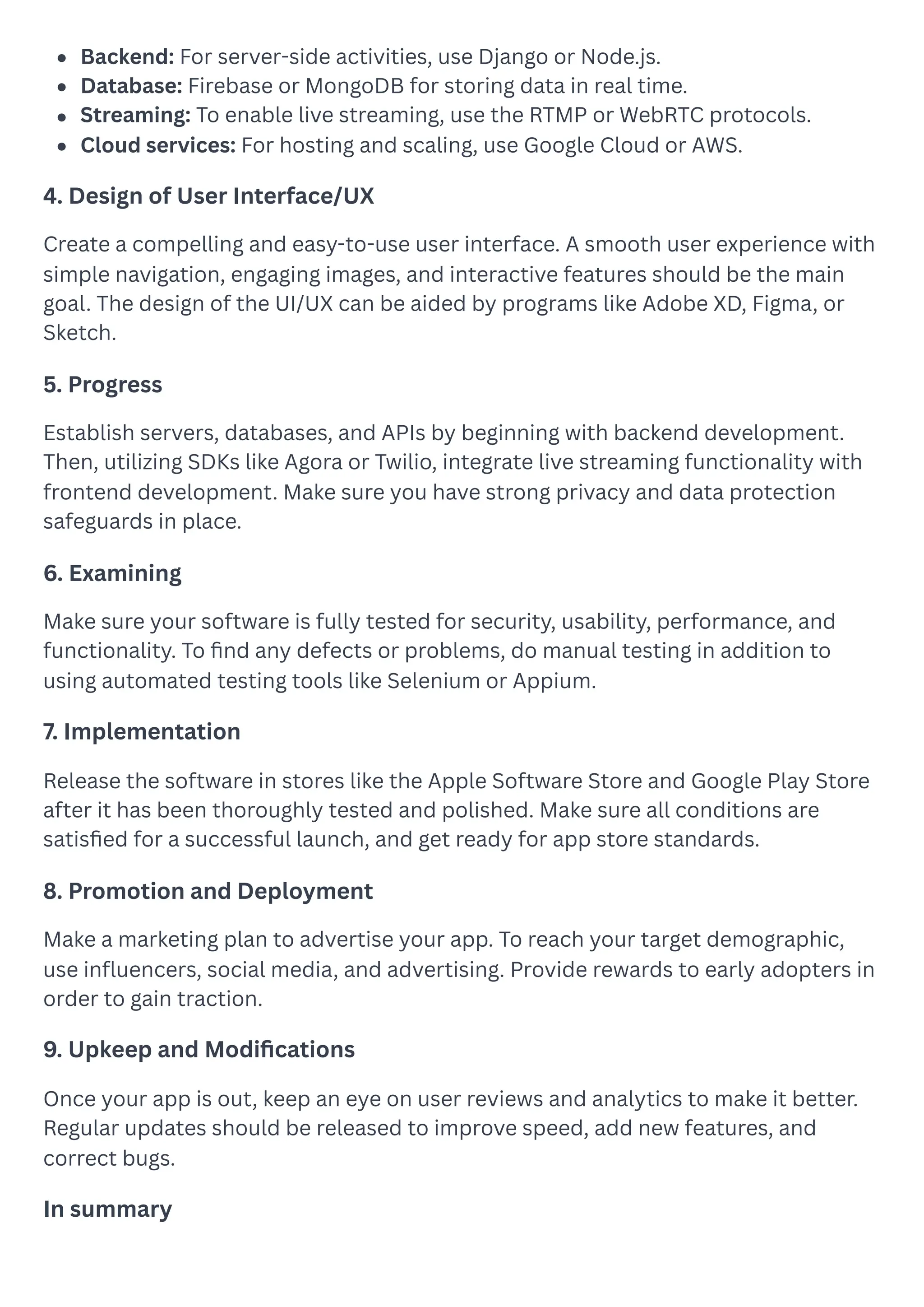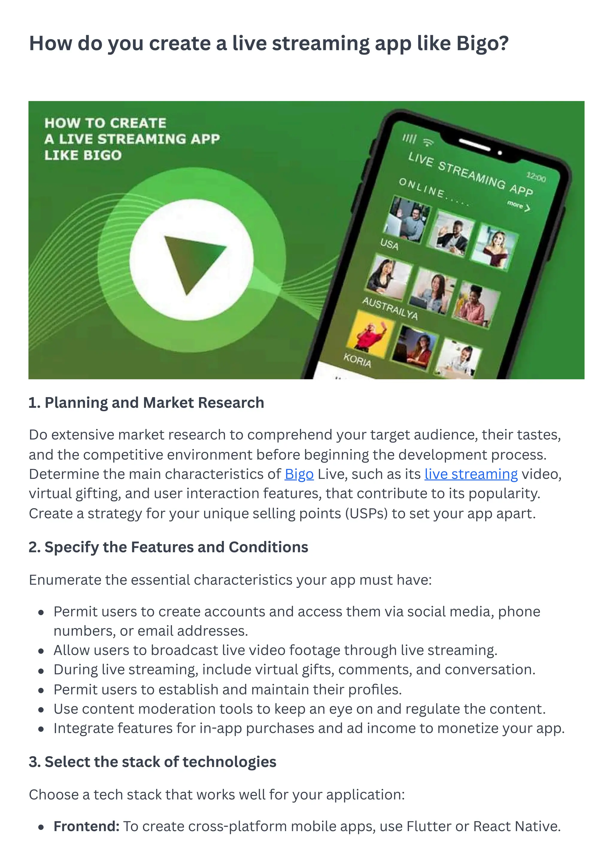 To create a live streaming app like Bigo, start with thorough market research to identify target audiences and features that will differentiate your app. Essential steps include selecting the right technology stack, designing an engaging user interface, and thoroughly testing the app before deployment. Post-launch, maintain and update the app based on user feedback, while employing effective marketing strategies to promote it.