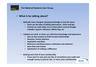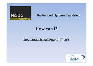 The document discusses establishing a regular segment called "How can i?" at National iSystems User Group meetings. This segment would involve briefly discussing the pros and cons of different solutions to common technical problems faced by iSeries/AS400 users. Suggestions for topics that could be discussed include reducing backup windows and accessing files from another system. The goal is to share knowledge, spark new ideas, and show relative benefits of solutions without any one presentation or sales pitch.