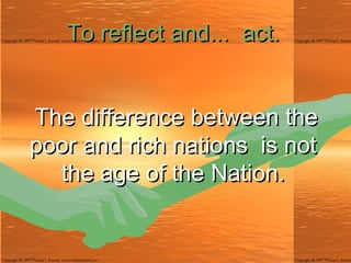 The document summarizes that the difference between poor and rich nations is not due to factors like the age of the nation, availability of natural resources, or intellectual abilities of people. Rather, the key difference lies in the attitudes and principles followed by most citizens of each country. Rich countries became prosperous because their people generally abide by principles like ethics, integrity, responsibility, respect for laws, work ethic, savings, productivity, and punctuality. In poor countries, only a small minority follow these basic principles in their daily lives. The document argues that countries will remain poor if their people lack the will to adopt and teach the attitudes of successful societies.