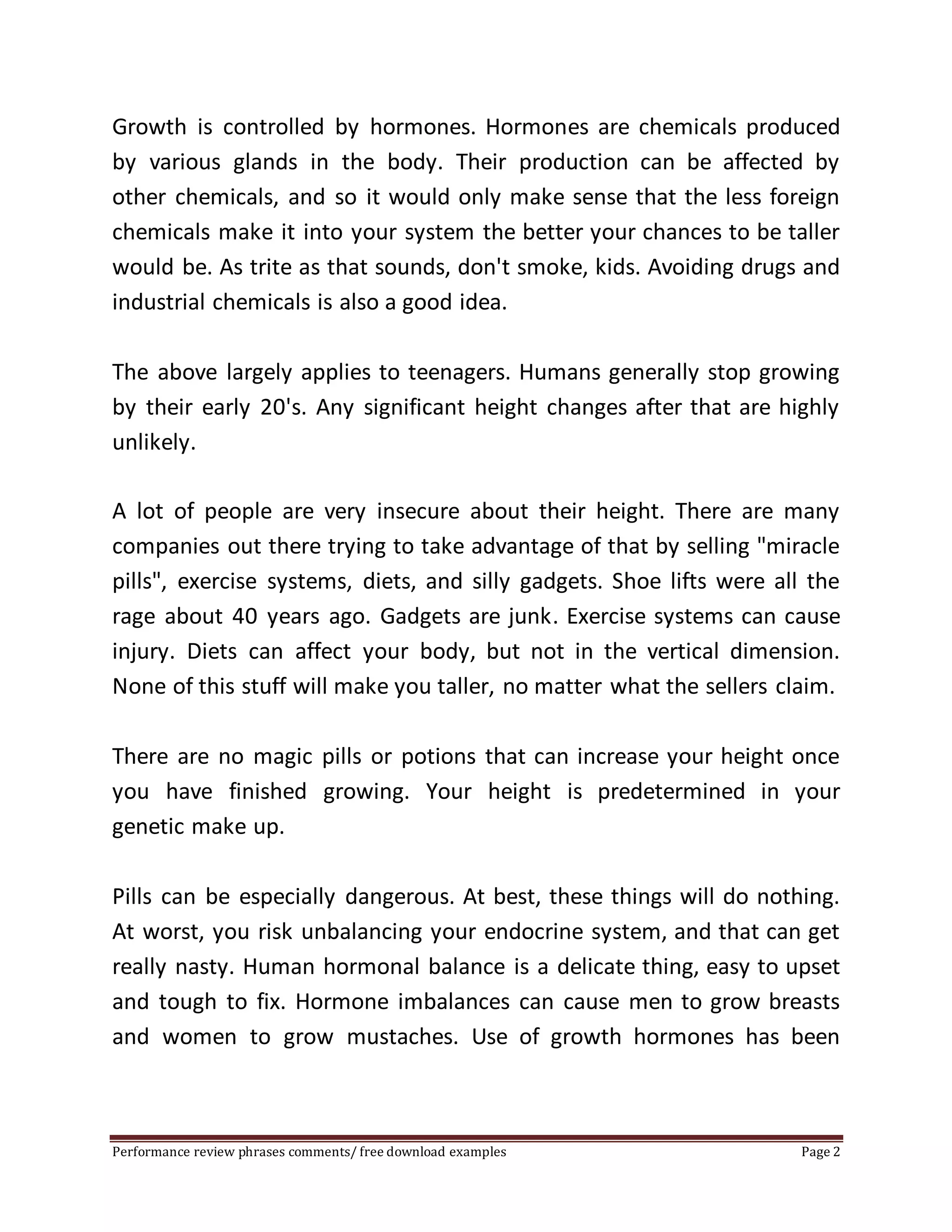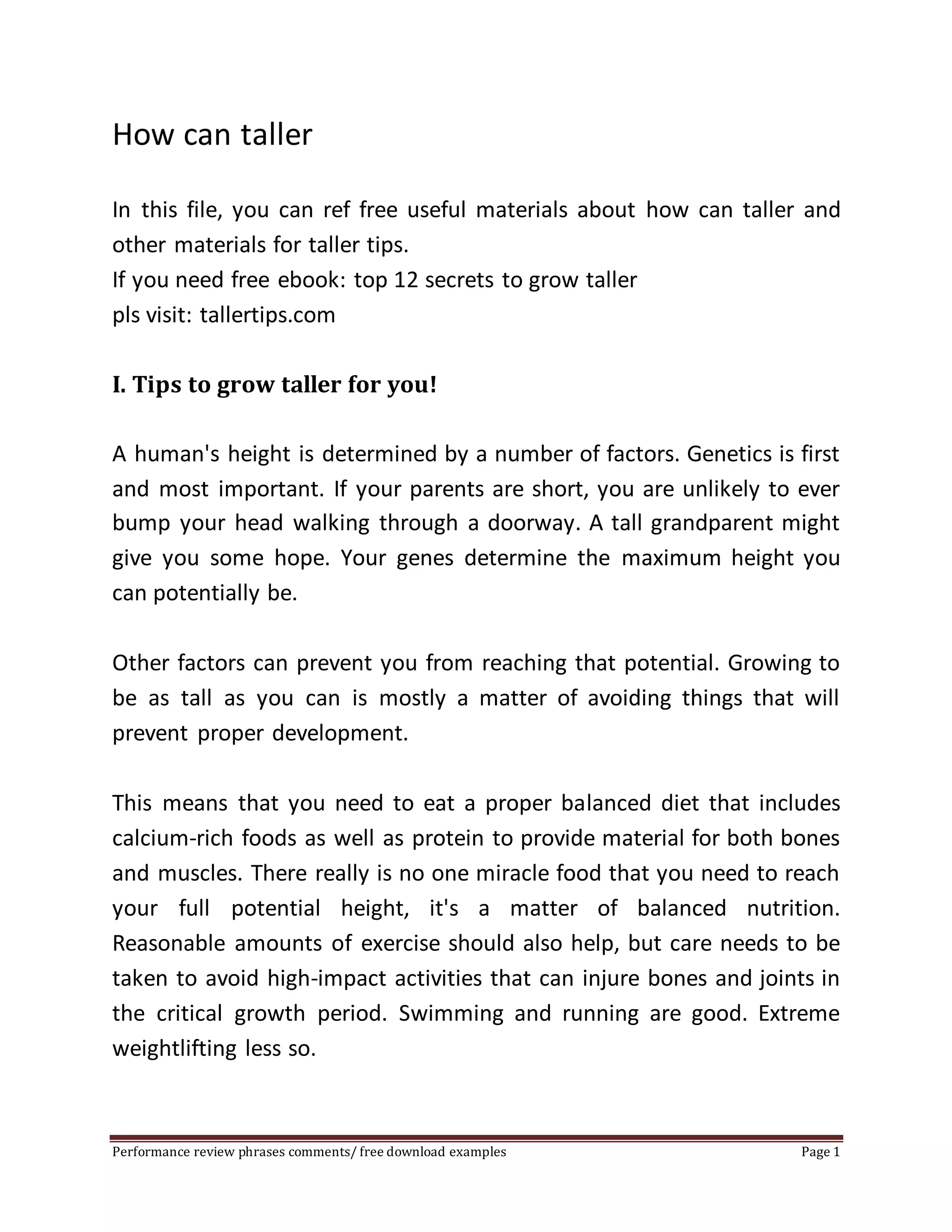 This document provides tips and information for how to potentially increase height. It states that genetics are the primary determinant of height, but other factors like nutrition, exercise, sleep, and avoiding stunting behaviors can help one reach their growth potential. A balanced diet with calcium, protein, vitamins D and zinc is recommended, along with regular exercise and 9-11 hours of sleep per night for teenagers. Avoiding drugs, smoking, malnutrition and other stunting influences is also advised. While genetics play a large role, following healthy habits may allow one to get closer to their maximum height.
