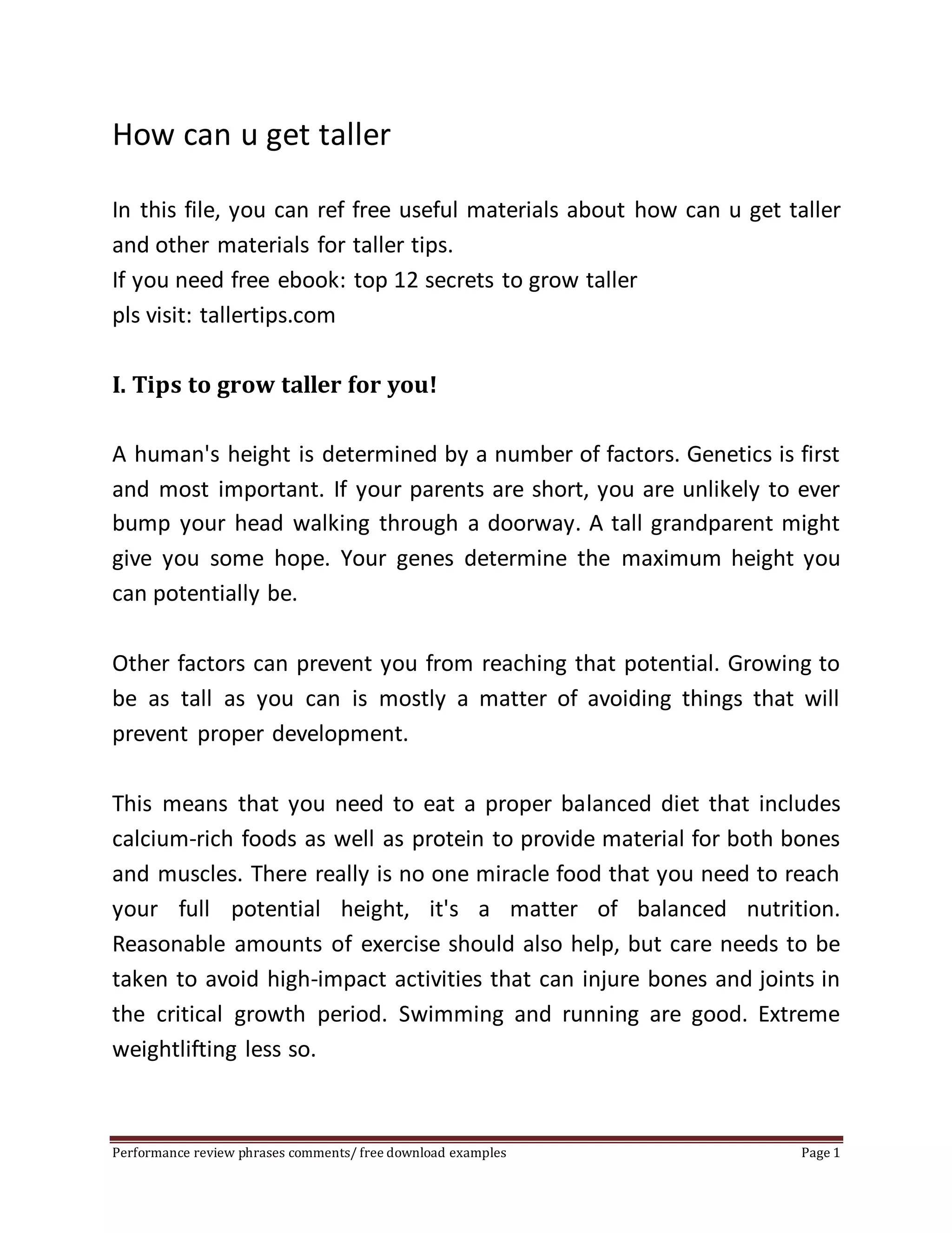 This document provides tips and information on how to potentially increase height. It states that genetics are the primary determinant of height, but other factors like nutrition, exercise, sleep, and avoiding stunting behaviors can help one reach their growth potential. The document recommends eating a balanced diet with calcium, protein and vitamins D and Z, as well as getting adequate sleep and exercise to promote natural growth hormones. It cautions that most growth occurs in teenage years and stops in the early 20s, and that no pills or supplements can increase height beyond one's genetic limits.