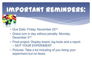 This document provides guidance for a student designing a science fair experiment to count the number of Skittles of each color in a fun-size packet. It discusses developing a question and hypothesis, identifying variables, writing a procedure to collect data, analyzing and presenting the results.