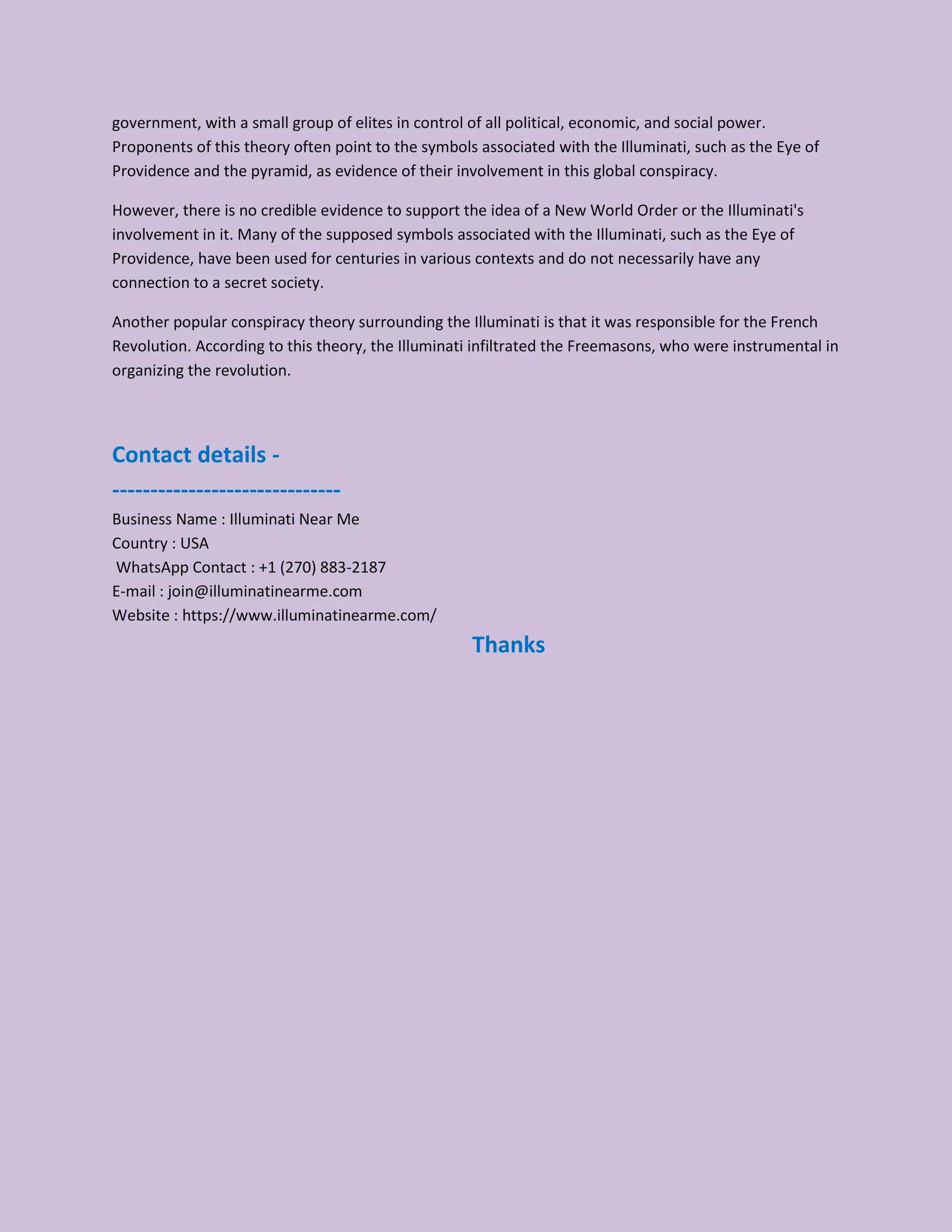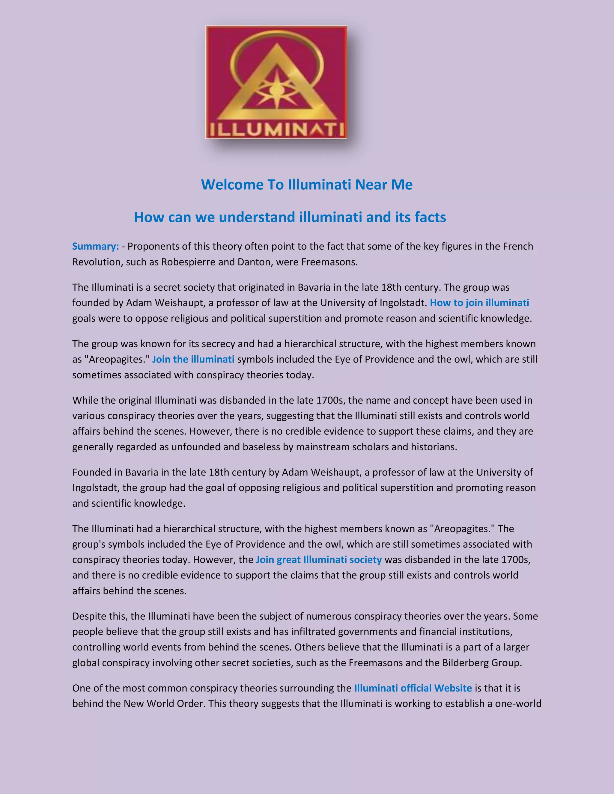 The document discusses the origins and characteristics of the Illuminati, a secret society founded by Adam Weishaupt in Bavaria in the late 18th century, aimed at opposing superstition and promoting reason. It outlines various conspiracy theories associated with the Illuminati, including claims of it still influencing world affairs and its supposed role in the French Revolution, though these claims lack credible evidence. The document also provides contact details for an organization named 'Illuminati Near Me.'