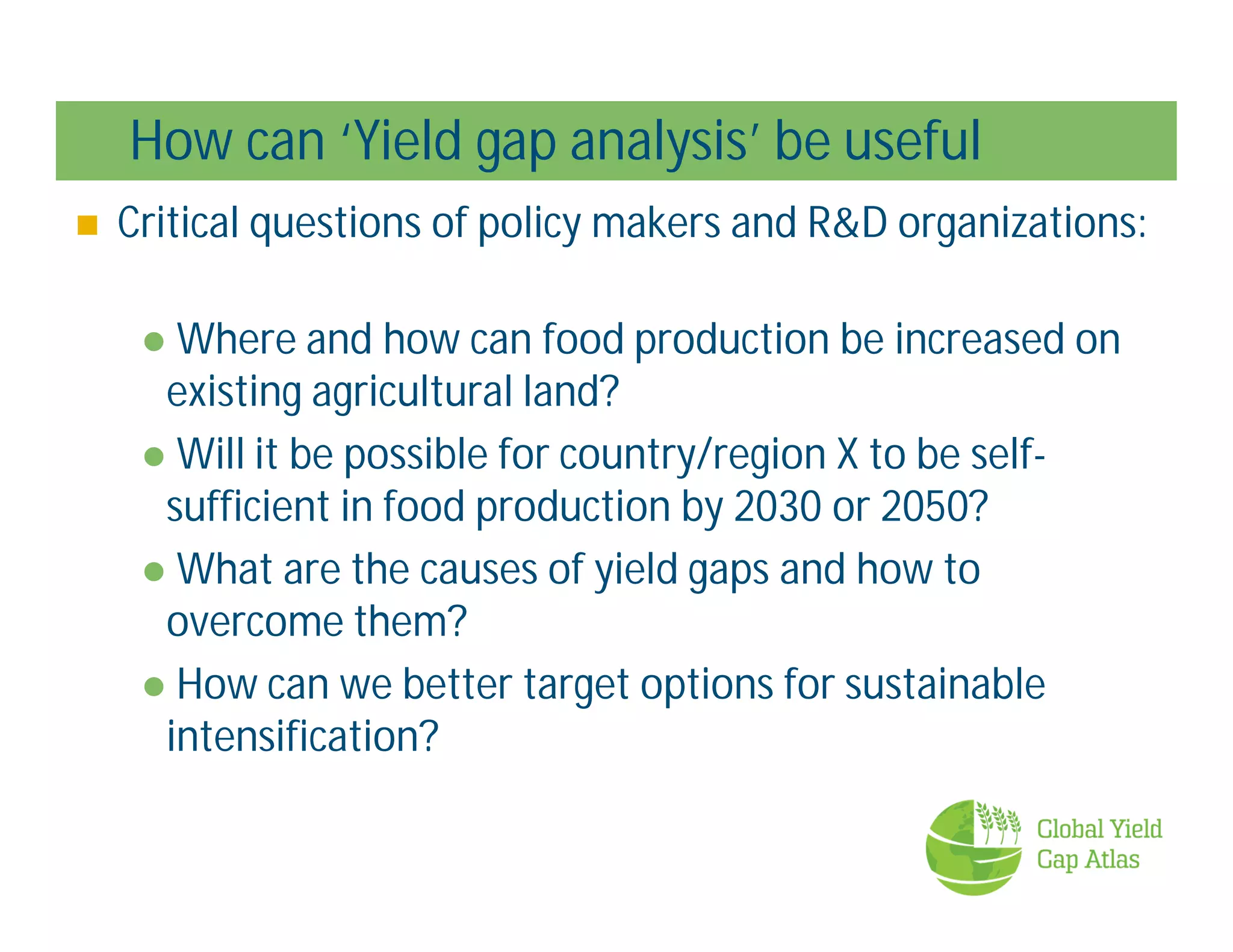 The Global Yield Gap Atlas (GYGA) aims to analyze and address yield gaps in food production by utilizing a novel 'top-down' and 'bottom-up' approach, combining gridded data with localized research to improve agricultural productivity. It offers an interactive platform that provides yield potential, yield gaps, and water productivity information for major crops across multiple countries, advocating for targeted research and technology transfer. GYGA emphasizes collaboration across scientific disciplines to tackle complex agricultural and food security challenges in the context of climate change.