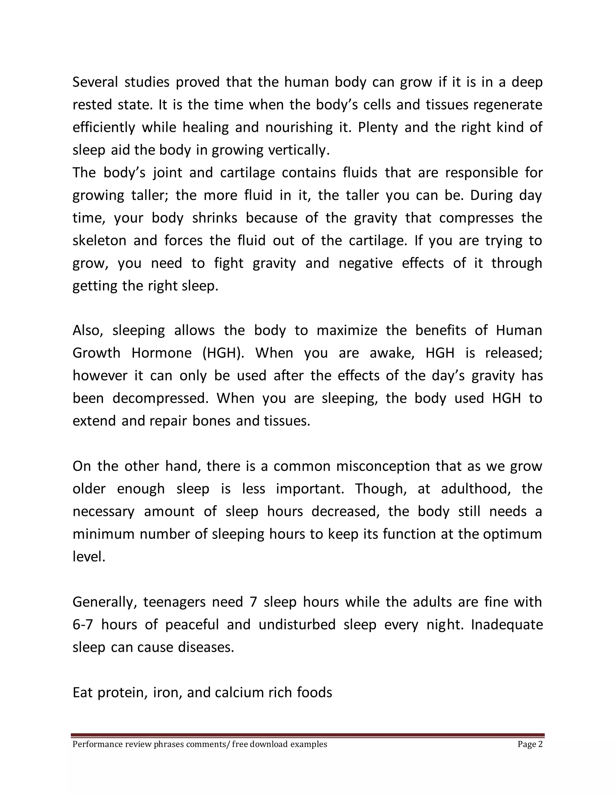 This document provides tips for growing taller faster, including getting enough sleep, eating a diet rich in protein, iron and calcium, exercising regularly, and maintaining healthy levels of growth hormones. Adequate sleep is important as it allows the body to take advantage of growth hormones to extend and repair bones and tissues. Exercise and certain nutrients also support bone and muscle growth. While genetics determine much of one's height, following a healthy lifestyle can help maximize a person's potential.