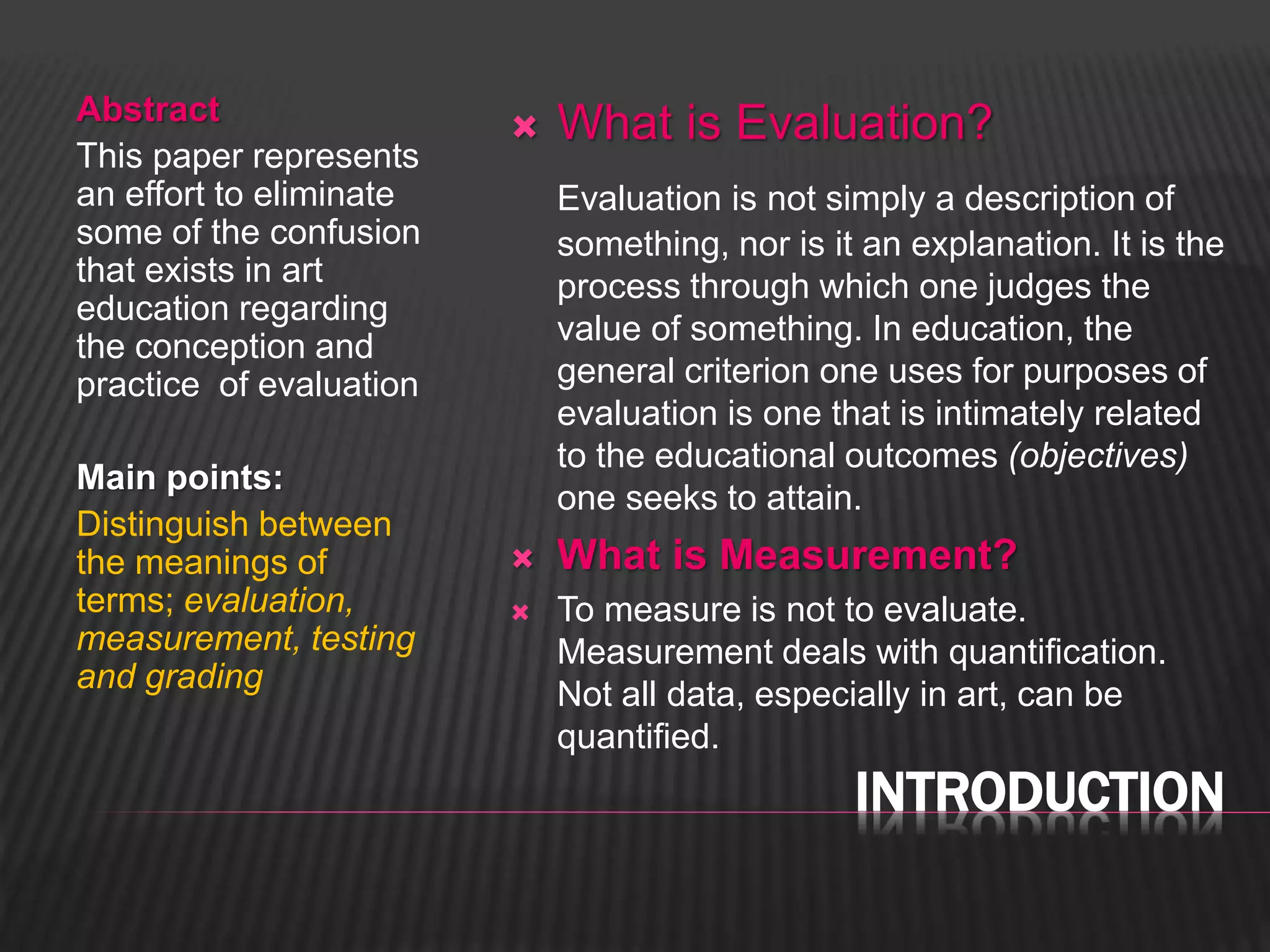 This paper discusses evaluation in art education. It distinguishes evaluation from measurement, testing, and grading. Evaluation involves judging the value of something based on educational objectives. The paper examines three ways to evaluate students' artworks: by comparing to prior work, peers' work, and criteria. It emphasizes evaluating both artistic production and creative process. The goal of evaluation is to improve curriculum and instruction by collecting data on student achievement.