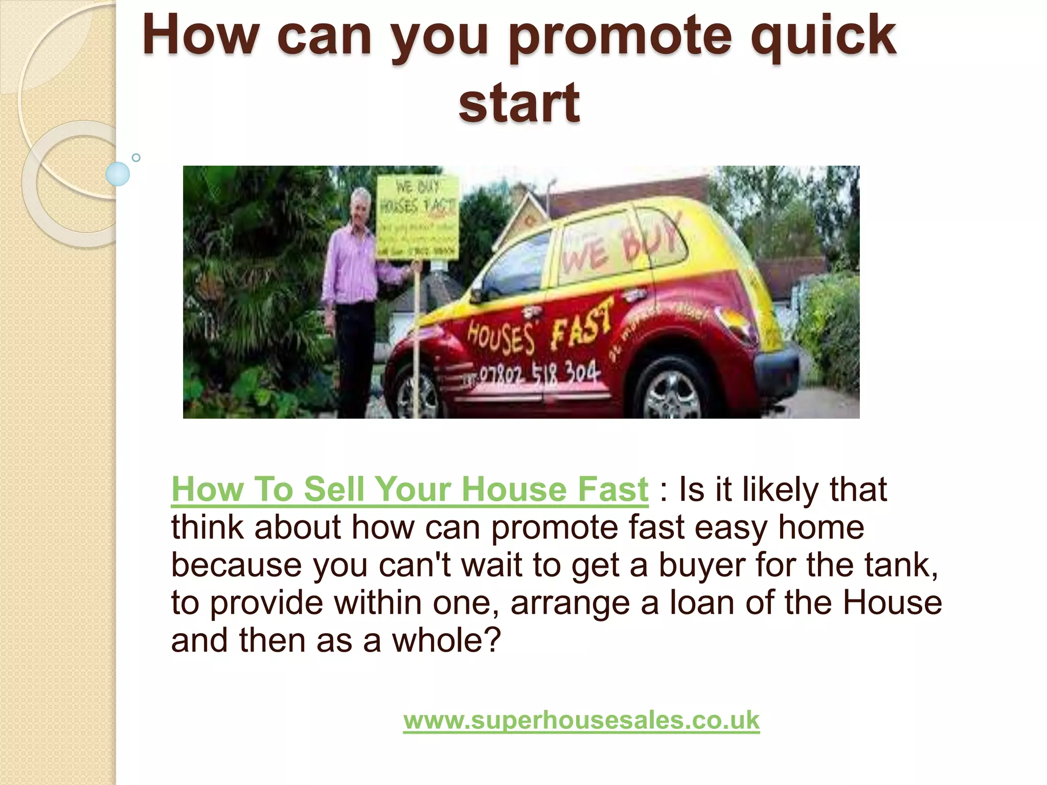 The document discusses how to promote and sell a house quickly. It suggests considering lowering the asking price to attract buyers who cannot wait long to purchase. Getting the house ready for sale through repairs or renovations can help promote a fast sale. Appraising the house accurately based on what buyers may be willing to pay is important for a quick sale.