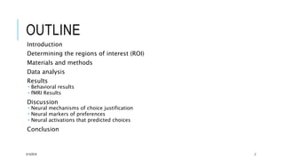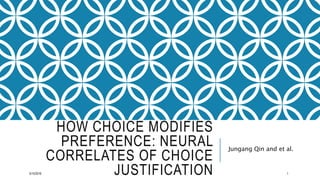 This study examined the neural correlates of choice justification. In a pre-scan session, participants rated their preferences for music CDs and then made a choice between CD pairs. In a post-scan session, they re-rated the CDs. Results showed participants increased their liking for chosen CDs more than rejecting disliked CDs. The fMRI data found regions involved in self-reflection and perspective-taking were associated with attitude change. Activity in areas related to preferences and subjective value, like the PCC, predicted choices and ratings. This study provides insight into the neural mechanisms underlying how choices modify preferences.