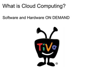 The document discusses how cloud computing can benefit businesses by providing on-demand software and hardware solutions. It emphasizes the importance of managing data for improved sales through techniques like customer segmentation and data mining. Various resources, such as Google Apps and Amazon Web Services, are suggested for leveraging cloud capabilities.