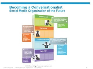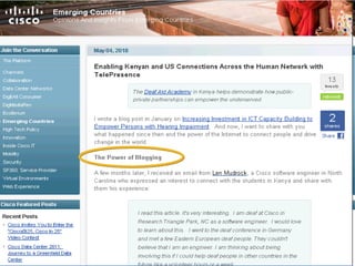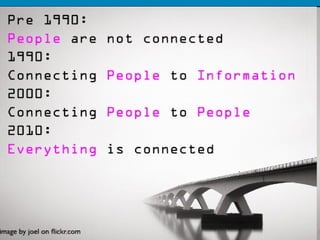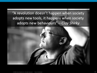 The document discusses the transformative power of collaboration and social media in the networking age, emphasizing how technology allows individuals and organizations to connect and share information more effectively. It highlights the shift in consumer trust from traditional advertisements to peer recommendations, and the potential for social media to enhance community engagement, particularly in emerging markets. The document also calls for a focus on relationships and meaningful interactions in the evolving landscape of communication.