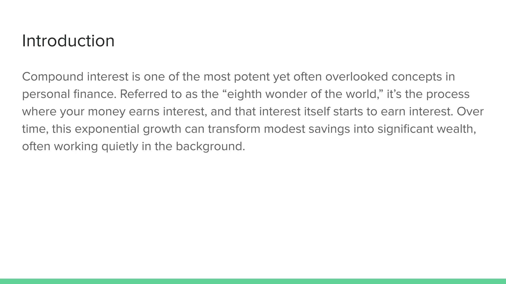 This presentation explores the concept of compound interest and its powerful role in building long-term wealth. It explains how compound interest works, why starting early makes a significant difference, and how consistent investing and reinvesting can lead to exponential financial growth. The presentation also highlights the downside of compounding in debt situations and offers practical tips for making compound interest work to your advantage. Designed for anyone looking to strengthen their financial future, this PPT simplifies a complex topic into clear, actionable insights.