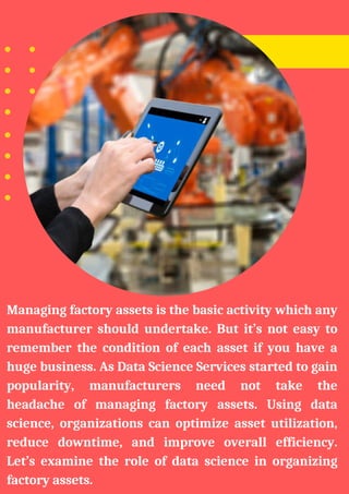 Data science significantly enhances manufacturing asset management by optimizing asset utilization, reducing downtime, and improving efficiency. Through advanced analytics, manufacturers can derive insights from data on equipment performance and maintenance, facilitating better decision-making. As the industry evolves, integrating data-driven strategies will be crucial for uncovering competitive advantages and growth opportunities.