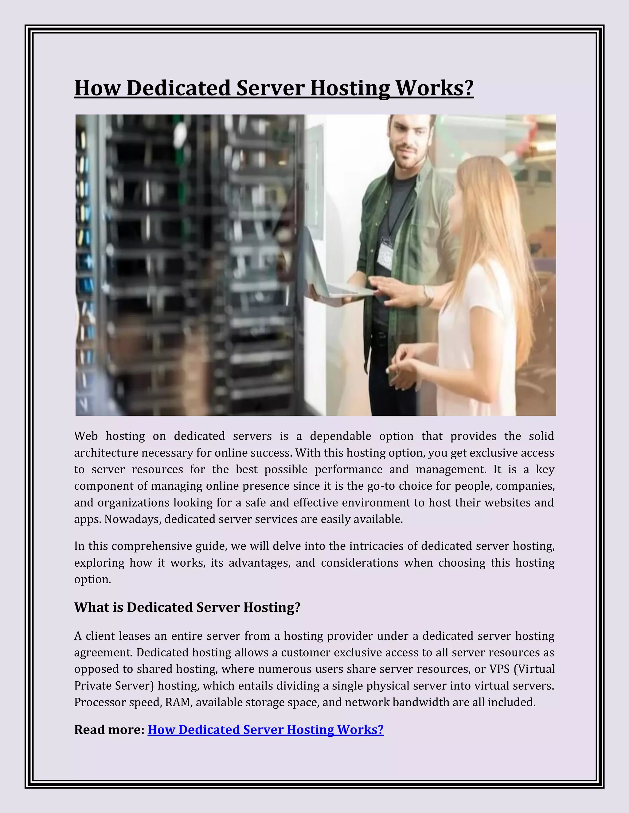 Dedicated server hosting offers exclusive access to server resources, ensuring optimal performance and management for websites and applications. It is ideal for individuals and organizations needing a secure and efficient hosting environment. This guide covers the workings, advantages, and considerations for selecting dedicated server hosting.