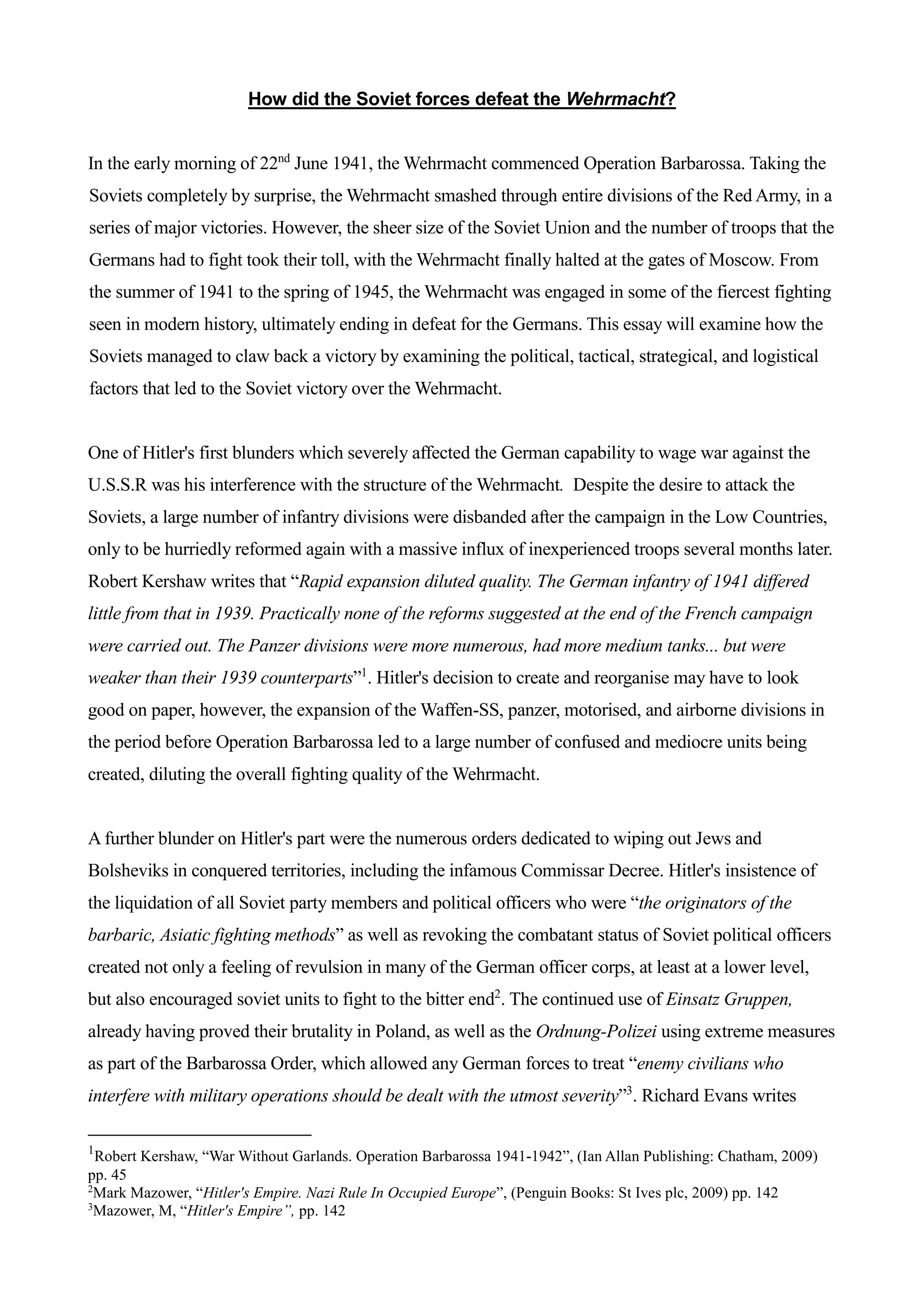The Soviet forces defeated the Wehrmacht through a combination of political, tactical, strategic, and logistical factors: