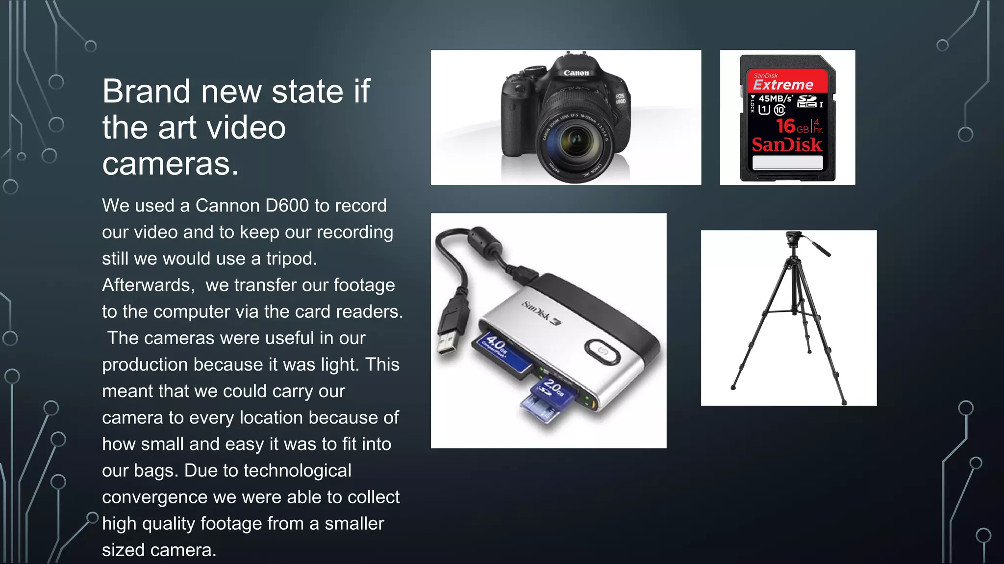 The document discusses the various media technologies used at different stages of a coursework project. A Canon D600 video camera was used to record high quality footage, which was then transferred to a computer via card readers. Google Blogger was used to document the project online with tags and embedded links. Social media allowed partners to communicate and plan meetings. The internet provided research resources, inspiration from past work, and access to sites like YouTube and Blogger. Photoshop and Adobe Premiere Pro were used for image and video editing, with Photoshop used to design packaging and ads, and Premiere Pro to construct music videos with fast cuts and filters.