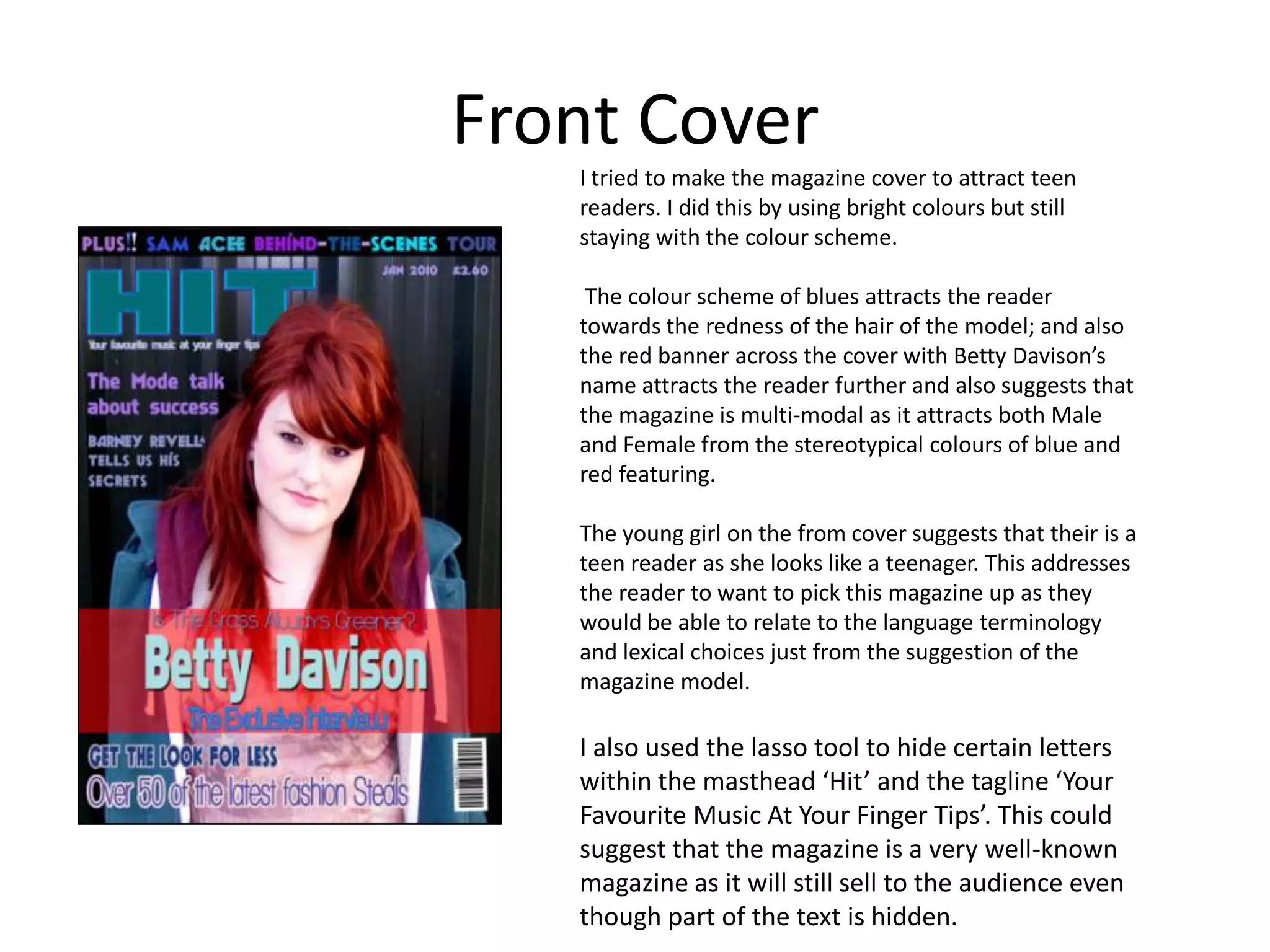 The document summarizes the magazine cover and contents page created by the student. The cover uses bright colors and features a teenage model to attract teen readers. It hides some letters in the masthead to suggest it is a well-known magazine. The contents page lists the stories and pages in a clear, professional manner to guide readers to articles that might interest them. Existing magazine contents pages were also researched for layout inspiration.