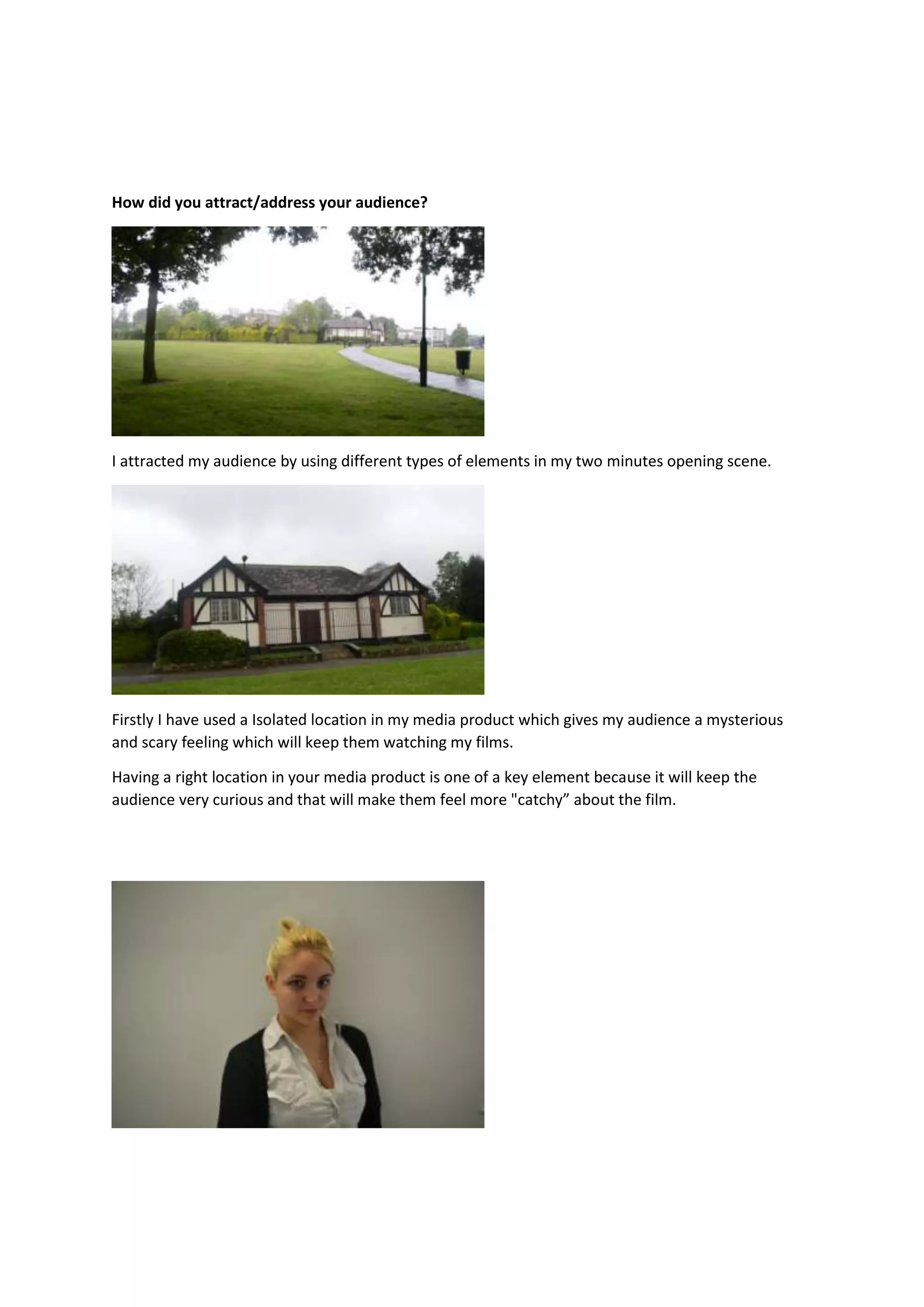 The document discusses different techniques used to attract audiences to a horror film opening scene. Key techniques included using an isolated location to create mystery and fear, casting an attractive young female lead and villain to appeal to different demographic groups, and carefully selecting sound effects from other popular films to elicit emotions like panic and tension and appeal to fans of those other films. The goal was to use multiple elements to attract a wide target audience to the film.