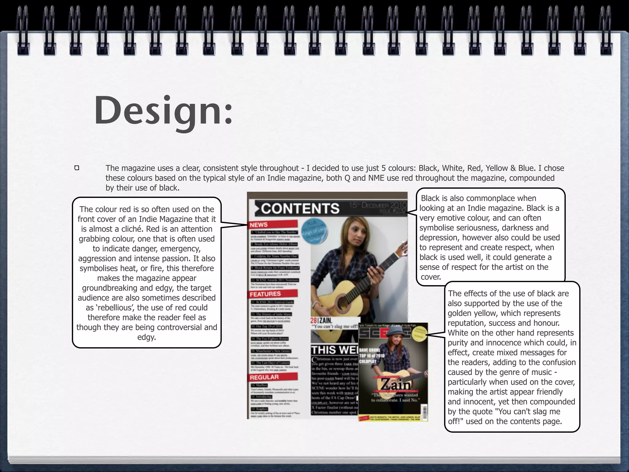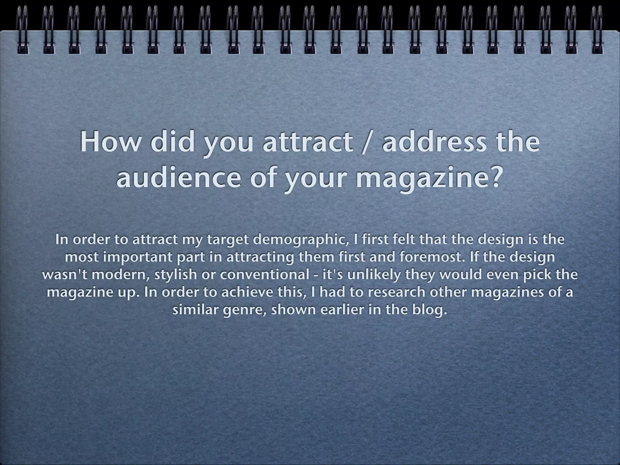 The document discusses how the author attracted their target demographic to their magazine. They focused on design first by researching other similar genre magazines and using 5 consistent colors - black, white, red, yellow, and blue. Red was used on the covers to grab attention as it symbolizes passion and edginess appealing to the rebellious target audience. Black created a serious tone while yellow represented success. Partnering with an established publisher could efficiently attract new audiences through cross-promotion in similar magazines.