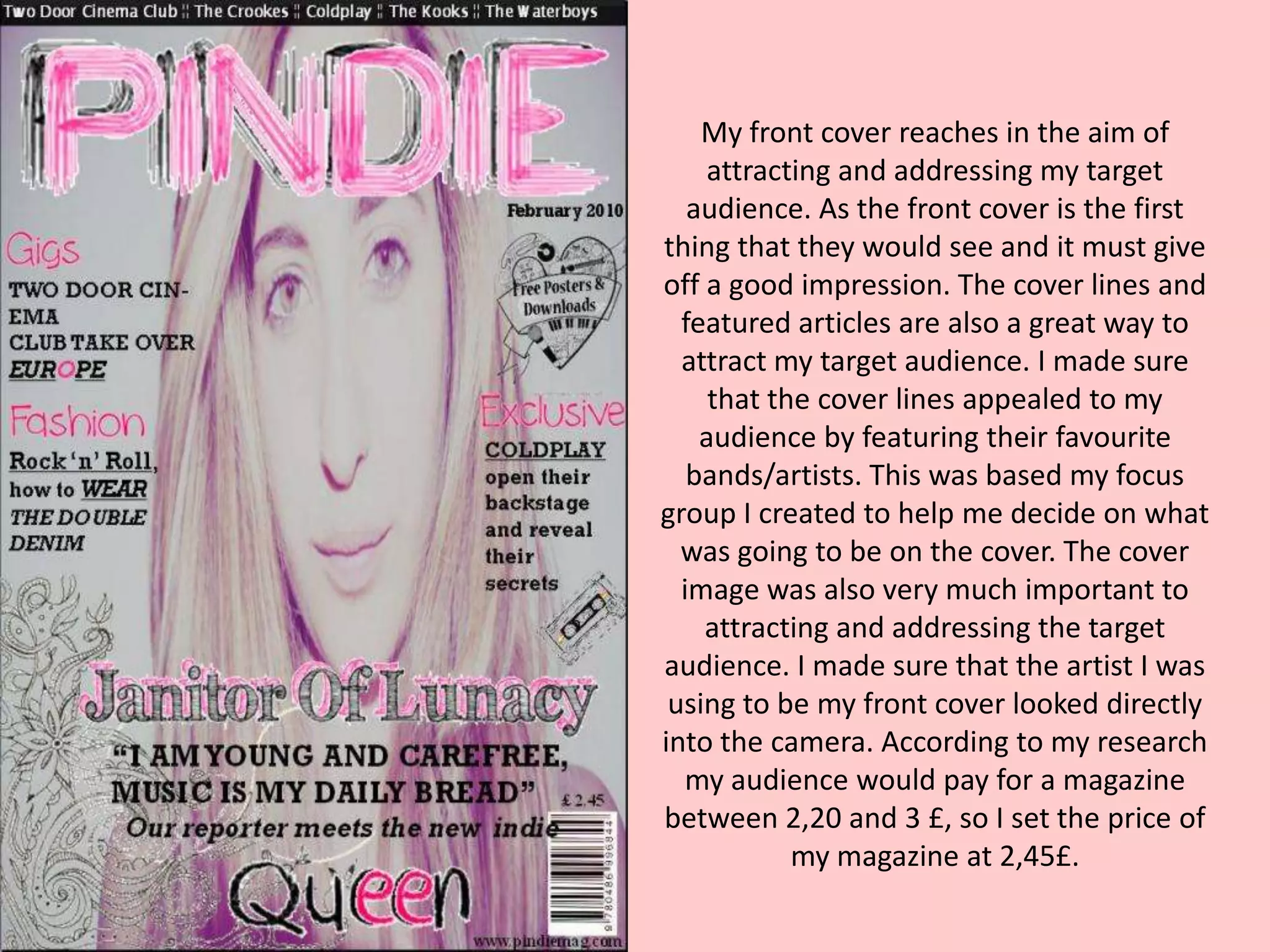 The document discusses the design choices for the front cover, contents page, and a double-page spread for a music magazine. The front cover features the target audience's favorite bands/artists to attract readers. A focus group helped decide the cover elements. The contents page uses images and keeps a consistent color scheme. The double-page spread maintains the color scheme and features a large cover image on one page with the title below, along with bold text and quotes to break up the column of text for easy reading.