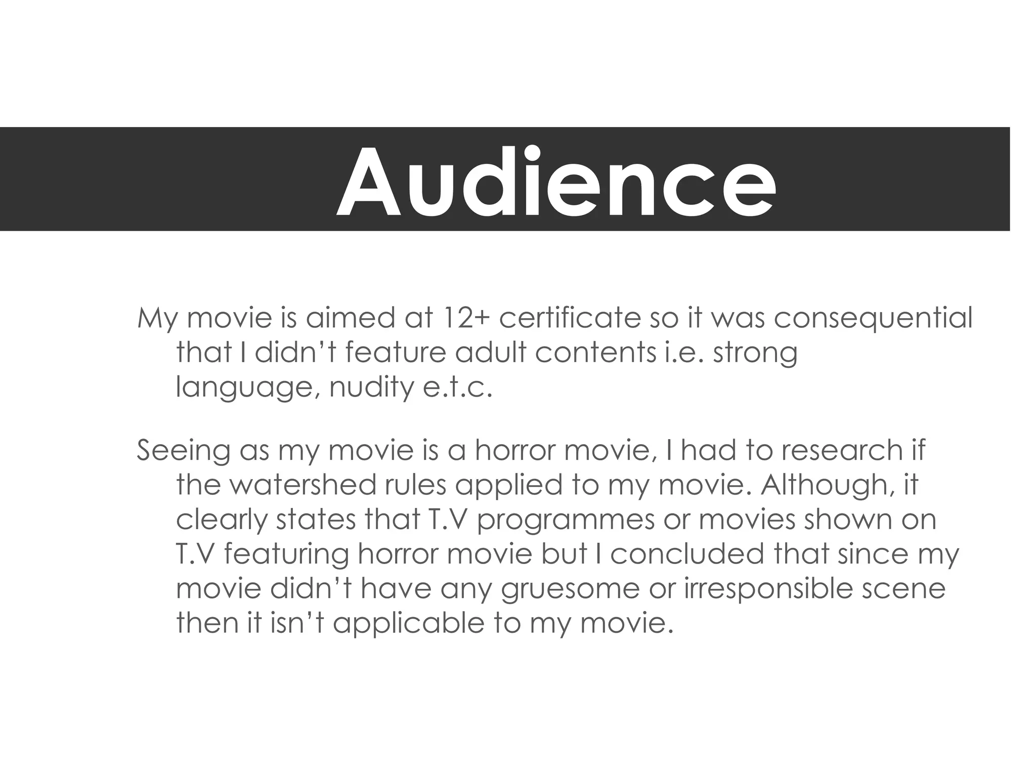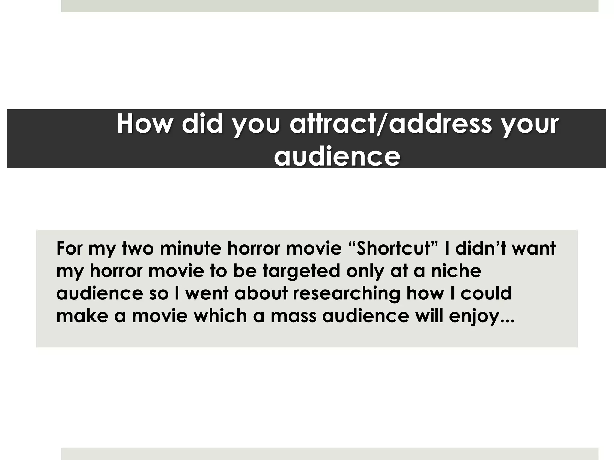 The document discusses how the filmmaker aimed to attract a mass audience to their two-minute horror film "Shortcut" while keeping it appropriate for a 13+ age rating. They researched age rating rules and received feedback that their quick shift from light to dark seemed amateur. However, surveys of their target 16-18 year old audience found that both genders enjoyed similar activities and the film equally. Sound effects were effective at building suspense and manipulating emotions as intended. Finally, the film incorporated two young actresses to make the characters more relatable to their demographic audience.