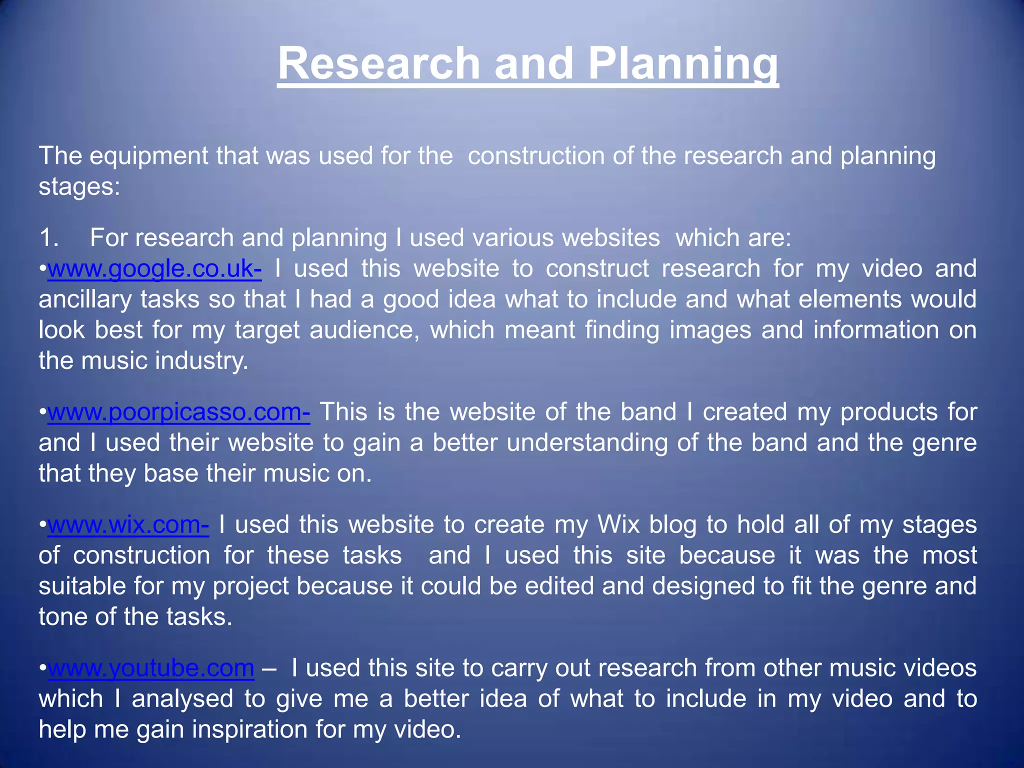 The document discusses the new media technologies used during the construction, research, planning and evaluation stages of a project to create a music video and ancillary tasks for a band. A variety of websites, software, and hardware were used including Google, Wix, Adobe Photoshop, Adobe Premier Pro, Microsoft Word, Microsoft PowerPoint, digital cameras, tripods, Sony cameras, and Facebook. These tools helped with research, planning, design, video editing, and evaluation. While the software helped complete the project, some like Adobe Premier Pro crashed occasionally, so different software may be used for future video editing.